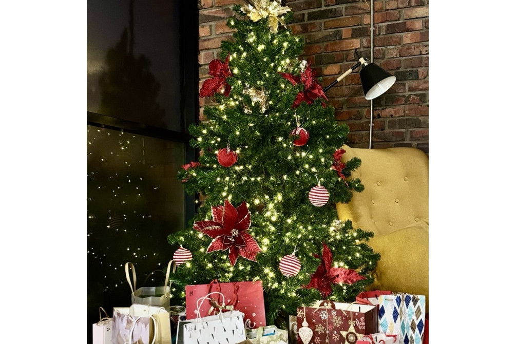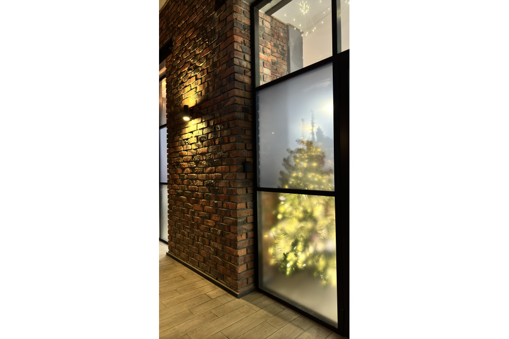 Красный кирпич, световые гирлянды, новогодняя елка и декор задают интригу праздничному вечеру.
