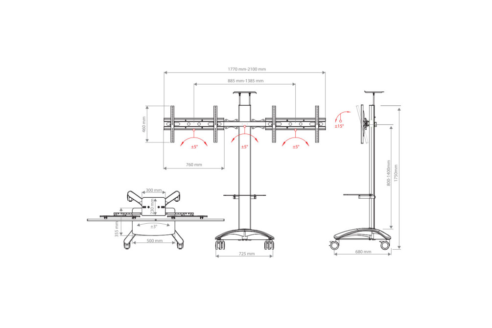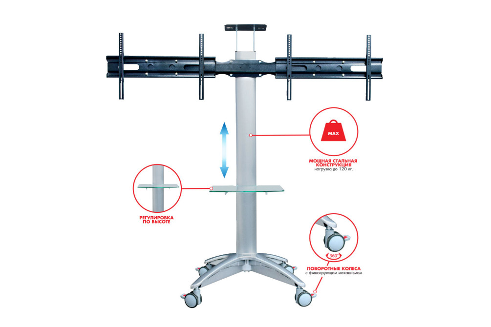 ARM MEDIA PT-STAND-15 гарантированно закрепит и удержит устройства с диагональю 26"-55" и весом 120 кг. Простая конструкция ARM MEDIA PT-STAND-15 идеально подойдет для самостоятельного монтажа. Мощная конструкция мобильной стойки позволяет надёжно удерживать дорогостоящее оборудование, а поворотные колеса с фиксирующим механизмом дают возможность плавно перемещать стойку в нужное вам место.