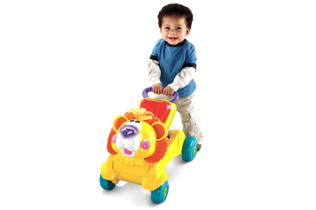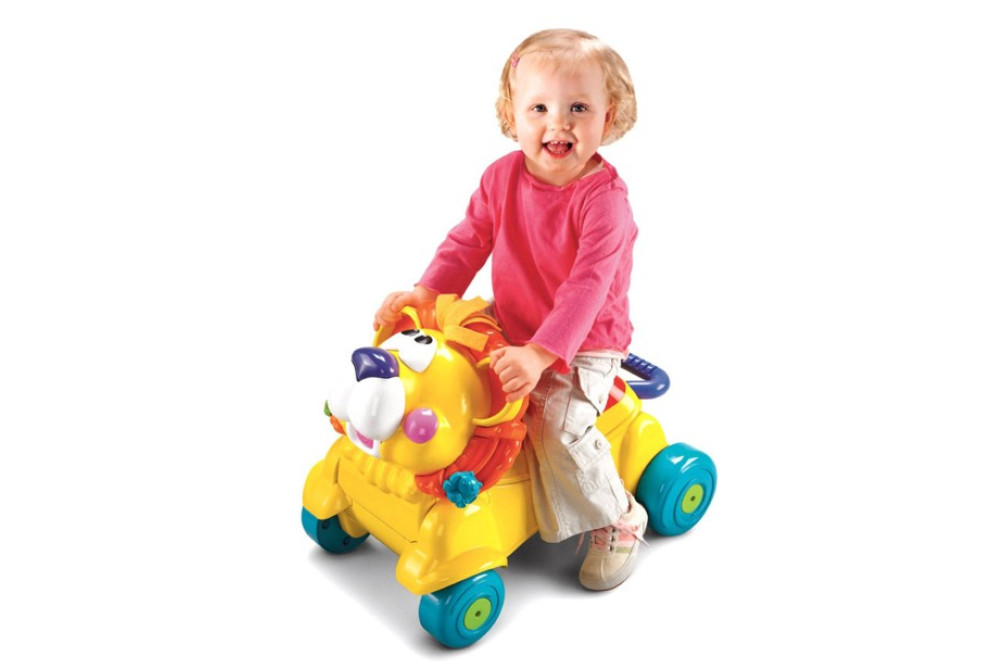 Ходилка-каталка «Лев» Fisher Price Рекомендуется детям с 9 до 36 месяцев. Высота игрушки от пола до сиденья составляет 22 см, от ручки ходунков до пола 38 см. Работает от батареек типа АА 2 шт. Прочное основание и широкие колеса игрушки делают ее надежной опорой для малыша, делающего свои первые шаги. Ребенок толкает львенка перед собой, держась за широкую опорную ручку. Если спрятать ручку-держатель, то ходунки превращаются в каталку. Малыш катается, отталкиваясь ногами от пола. Нажми на носик игрушечного льва, и он дружелюбно зарычит или засмеется. Носик будет мигать, и переливаться при проигрывании веселых мелодий.