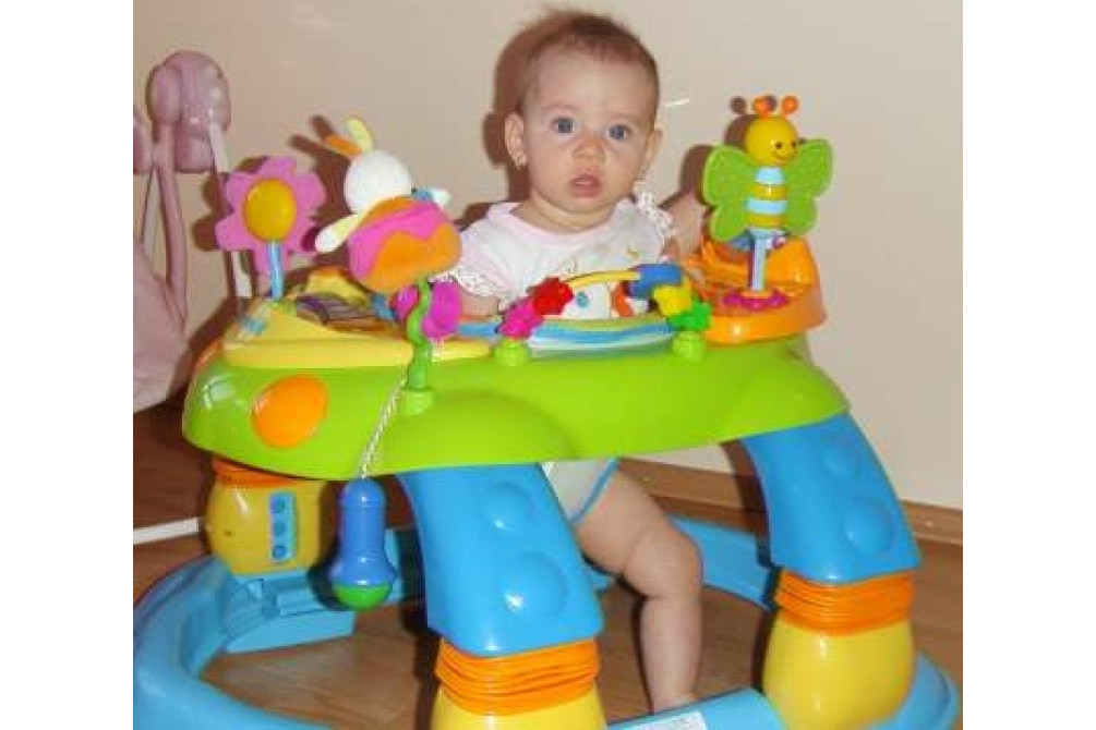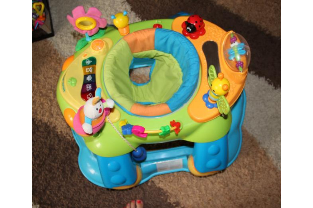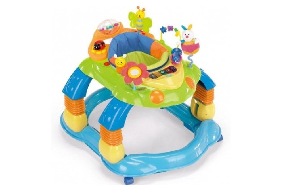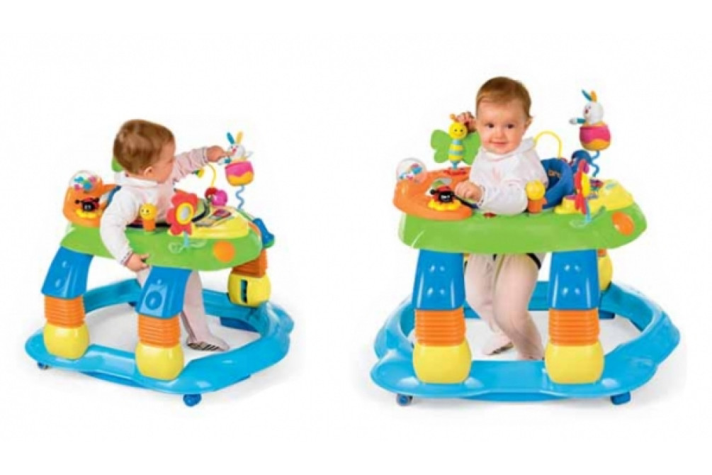 Ходунки-качалка-активный центр Brevi Giocagiro 3 в 1 предназначены для детей от 6 до 12 месяцев. Предусмотрено использование на выбор: в качестве ходунков, креслица-качалки или игрового центра, благодаря убирающимся ножкам. Игровая интерактивная поверхность предлагает 14 веселых игрушек, награждающих усилия малыша световыми и звуковыми сигналами и развлекательными моментами; благодаря сиденью, поворачивающемуся на 360° все окружающие ребенка игрушки находятся в пределах его досягаемости. Ходунки Giocagiro оснащены системой регулировки в трех положениях высоты, а для гарантии максимальной безопасности – передним и задним механизмом противоскольжения, который блокирует ходунки вблизи лестниц и ступеней. Также ходунки оснащены двумя поворотными колесами; кроме того, ходунки являются сверхлегкими и защищают ребенка от углов мебели специальными противоударными краями.