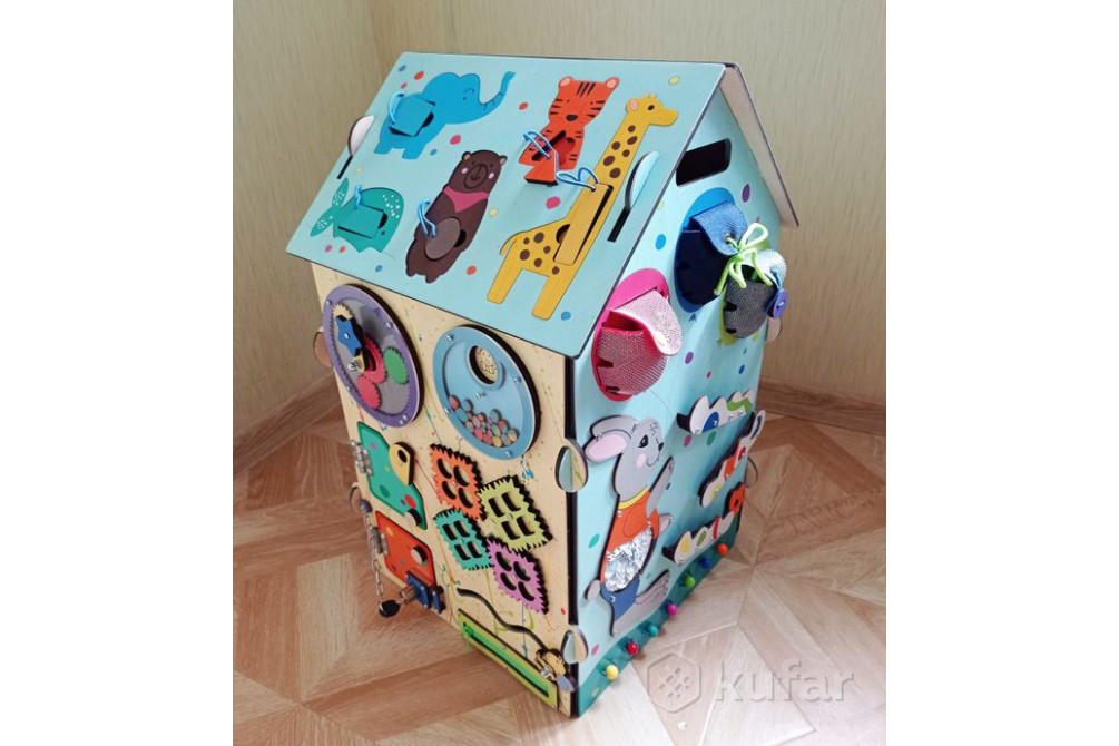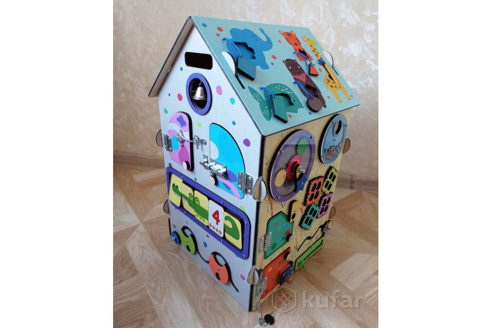 Сторона А: 2 дверки с крючком и шпингалетом, которые так нравится дергать деткам. Крути веселые квадратики и изучай цифры, а потом собери веселого крокодила! Лабиринт с подвохом на развитие логического мышления у крохи. Колокольчик!