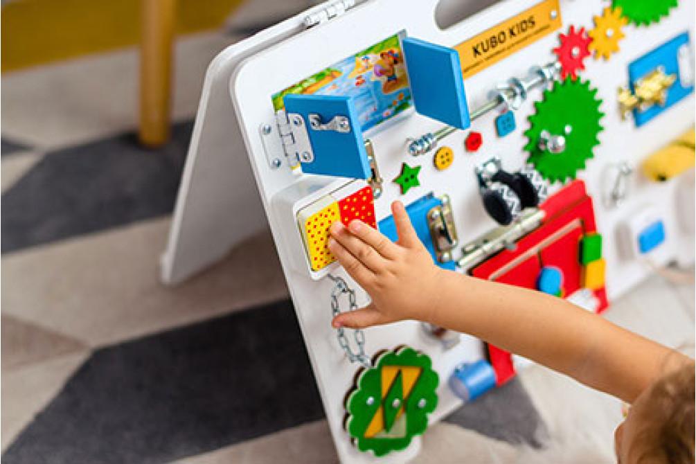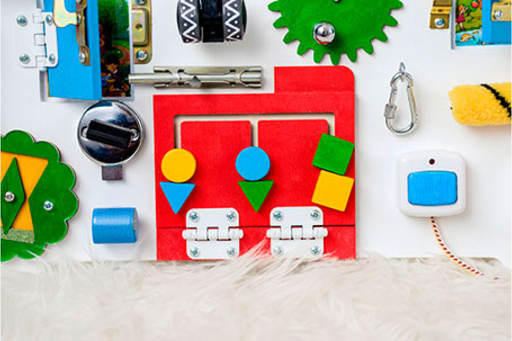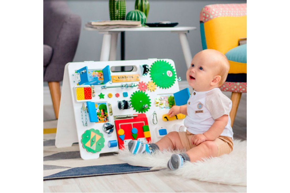Яркий, красочный двусторонний бизиборд от КубоКидс представляет собой доску Монтессори, на одной из сторон которой расположено более 20 интересных и полезных для ребёнка интерактивных обучающих элемента, среди которых вращающиеся шестерёнки с картинками животных, головоломка "собери цвета/фигуры", различные дверцы с замочками, выключатель, кнопки, песочные часы и др.