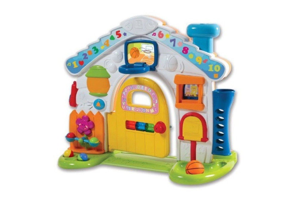 С помощью домика ребенок овладеет новыми навыками: научится бросать мяч в кольцо, шарики в камин и боковое лукошко, сможет покатать их на равновесных качелях.