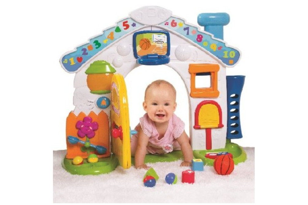 Этот домик как настоящий: у него есть дверь, проползая через которую, кроха услышит реальный скрип, кроме этого у дома есть окно, которое можно открывать и смотреть через него на улицу на проезжающие машины и слушать их гудки и щебетание птичек. Любознательный малыш познакомится с устройством часов: узнает, что у них есть циферблат, цифры от 1 до 12 и 2 стрелки, которые можно крутить.