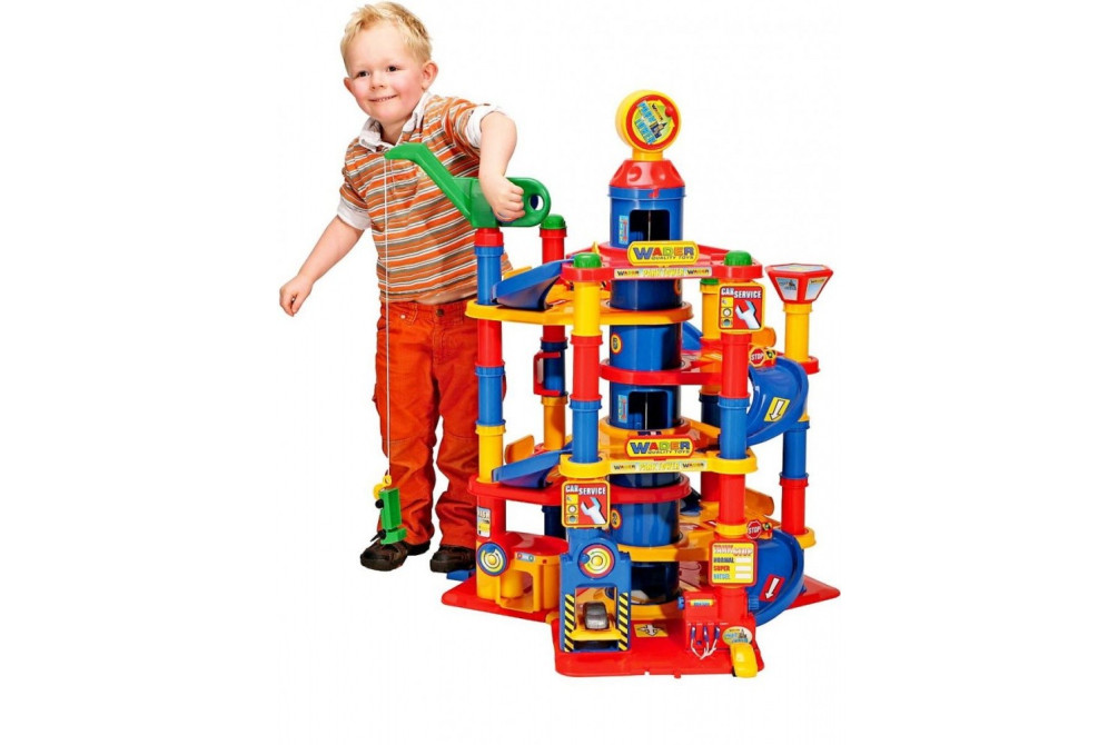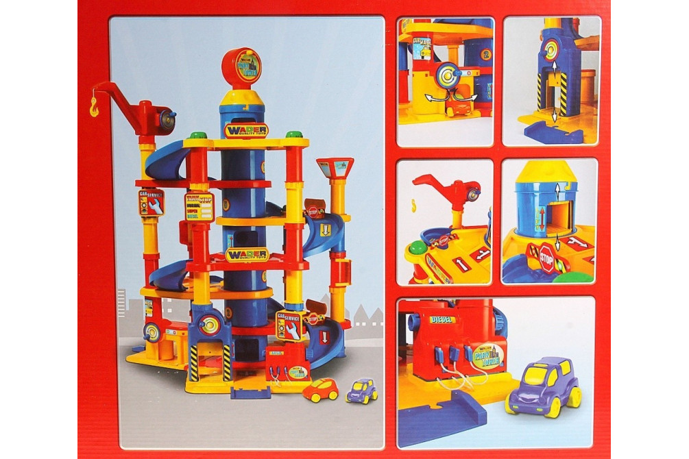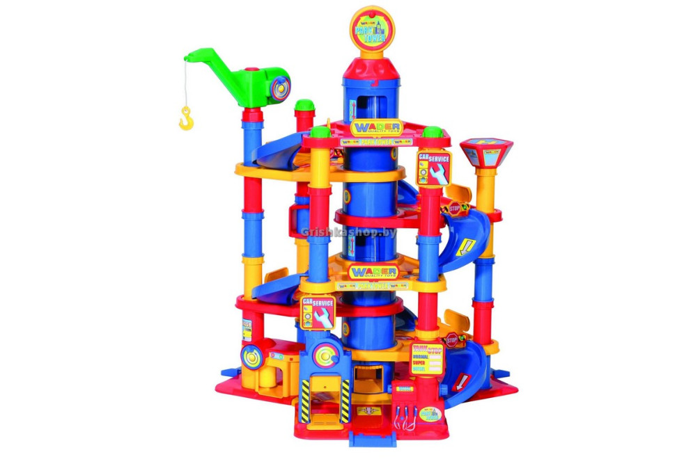 Самый большой паркинг. Семиуровневая парковка. На первом уровне паркинга находятся заправочная станция, автомастерская (подъёмник), автомойка. На остальные уровни автомобили могут подняться на лифте. Самое интересное для мальчишек - это спускать машины с этажей по съездам паркинга. Все указанные игровые элементы приводятся в движение с помощью ручного привода, то есть для игры ребенку нужно повернуть рукоятку возле подвижного элемента. В комплекте 2 автомобиля. 7-уровневая башня-паркинг предоставит ребенку множество развлечений, а именно: 7 уровней парковки, АЗС, мойка, ремонтная секция, кран, лебедка. В центре паркинга располагается лифт, который подымает машинки на все уровни. В комплект также входит две машинки. Размер изделия в упаковке, мм (д*ш*в) 595х185х770 Размер игрушки в собранном виде, мм (д*ш*в) 770x710x950