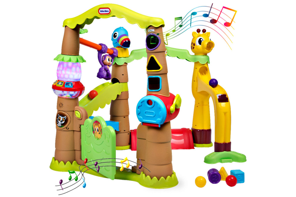 Это сказочный мир джунглей! Малыш обязательно захочет покормить обитателей животной среды пятнистого тукана и желтогрудого жирафа разноцветными шариками, входящими в комплект. Забрасывая фактурные мячики в ротик или клюв, маленький любознатель будет наблюдать, как они скатываются по серпантину и падают вниз. Игровой комплекс знакомит с причинно-следственными связями, развивает воображение, фантазию.