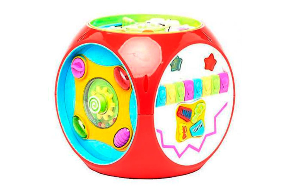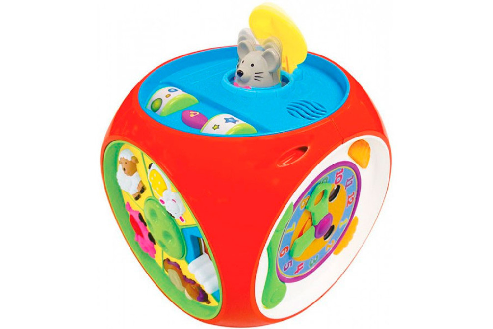 На 6 сторонах куба ребенок обнаружит двигающуюся фигурку мышонка, изображения домашних животных с вставками из различных тканей для развития тактильного восприятия, пианино с 8 разноцветными клавишами, часы, с помощью которых он научится определять время и изучит цифры, и даже игрушечный CD-плеер, в который может установить входящий в комплект "CD-диск" и прослушивать веселую музыку.