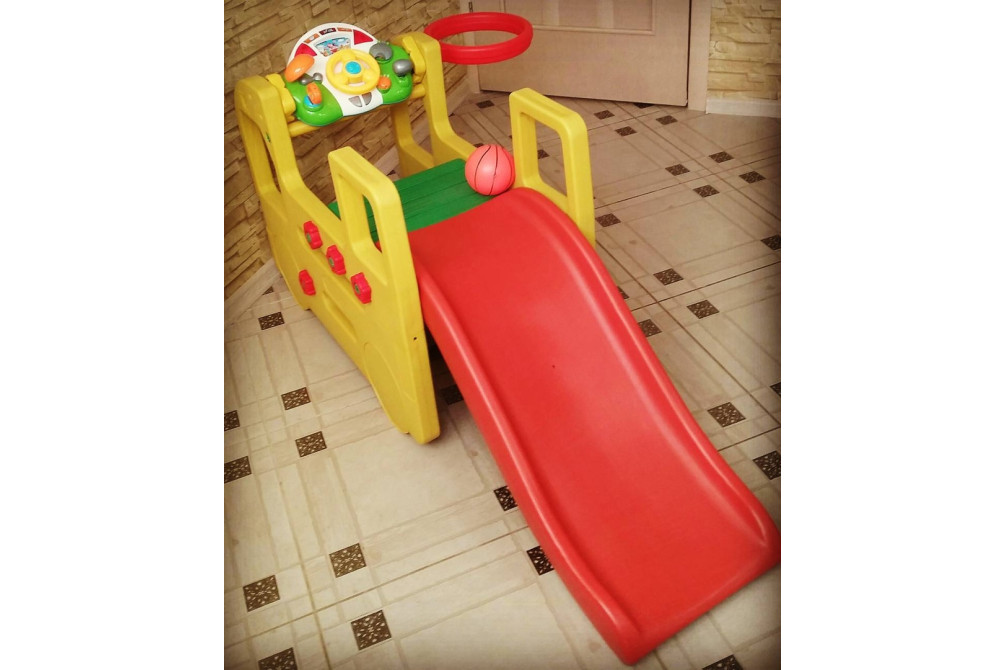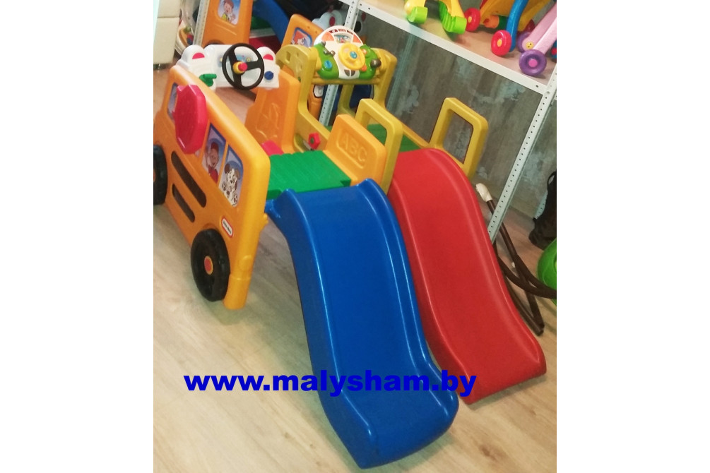 Представляет собой многофункциональный игровой комплекс в виде автобуса со встроенной горкой, баскетбольным кольцом и игровой панелью. Ребенок сможет скатиться с горки, длина которой составляет 100см, побросать мяч ( входит в комплектацию) либо почувствовать себя в роли водителя.