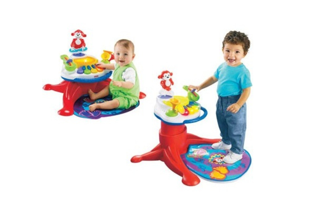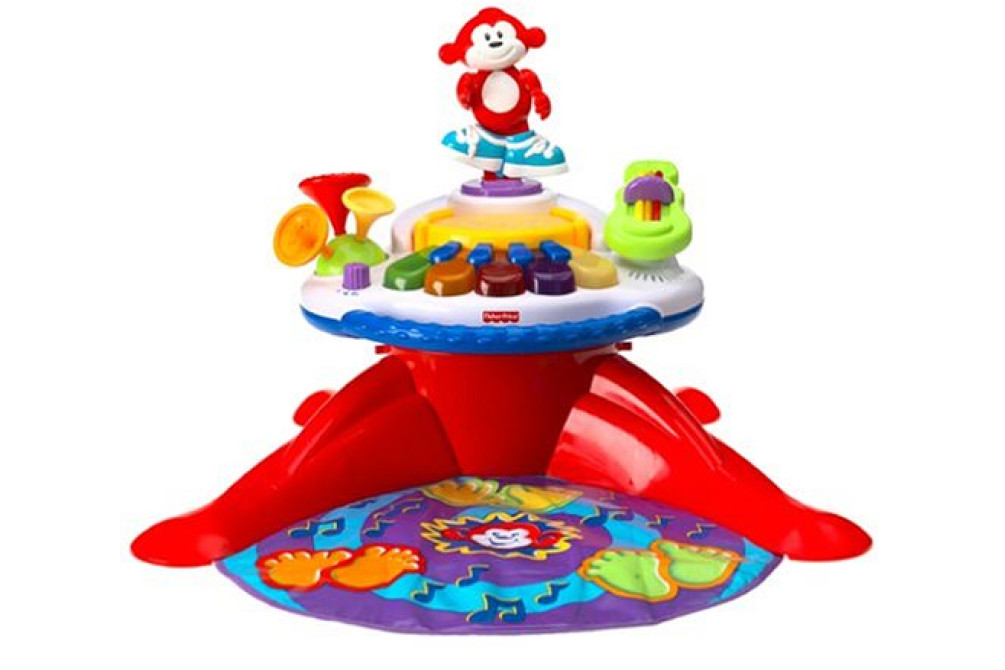 "Оркестр" Fisher Price Рекомендуемый возраст от 6 месяцев и старше. Играем сидя. Малыш сидит на интерактивном коврике и активно играет на всех инструментах. Кроме арфы и фанфар есть барабан и пианино с 5 большими клавишами. Можно выбрать один из 3-х музыкальных режимов в игре. Причем в каждом из них свои музыкальные возможности. Малыш нажимает клавишу пианино и слышит ноту, затем играют ударные инструменты и бегают разноцветные огоньки по клавишам и барабану под ритм ударных. Если опустить рычажок арфы, тогда к мелодии подключаются звуки арфы, если нажать на барабан – добавляются ударные звуки, если на фанфары - мелодия украшается новыми звуками. Во время игры обезьянка, установленная во главе центра, не бездействует, а принимает активное участие в игре. Сначала она танцует на месте, двигая телом, руками и ногами, как бы приглашая, потанцуй со мной. При нажатии на арфу, барабан или фанфары обезьянка танцует и поворачивается под звуки инструментов, мелькание огоньков. Игра занимает малыша и продолжается снова и снова. Играем стоя. Малыш, стоя на коврике, может управлять звуками центра и движениями обезьянки ножками. Он нажимает на нарисованные, на коврике картинки и сам вместе с обезьянкой танцует под музыку. В центре есть регулятор громкости на 2 положения.