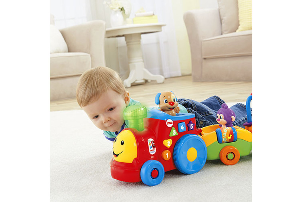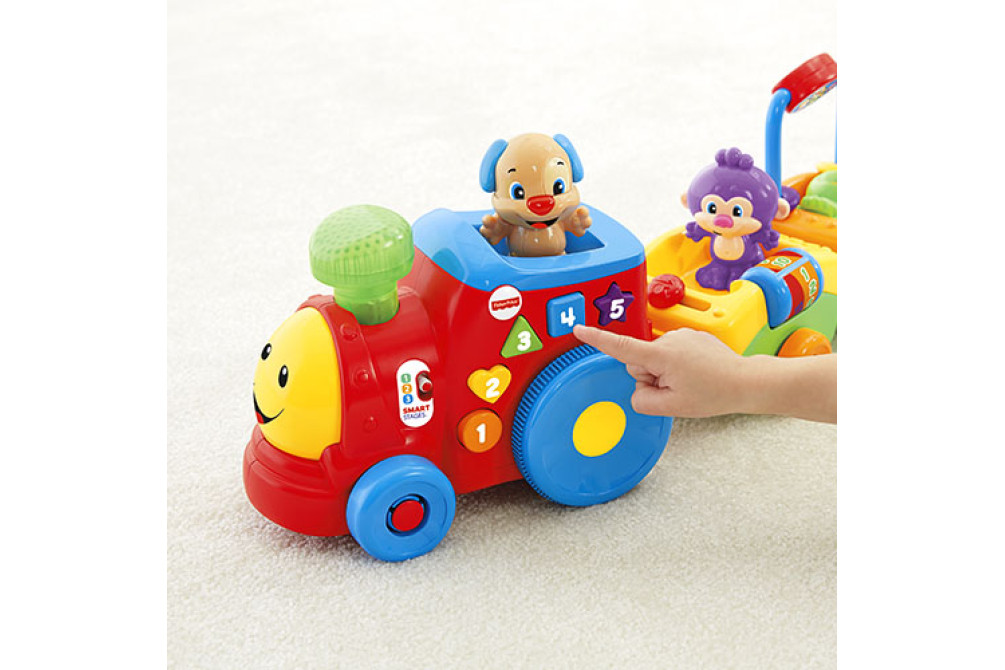 Для детей от 6 месяцев. Паровозик может двигаться сам, стоит только нажать на трубу. Движение сопровождается музыкой, светом и реалистичными звуковыми эффектами (более 50 звуков). В каждом вагоне едет пассажир - лягушонок, обезьянка и щенок. На вагонах предусмотрены дополнительные игровые элементы: бегунок-божья коровка, вращающийся барабан и ручка с перекидными пуговками. 3 режима игры предусматривают изучение букв, цветов, проговаривание фраз и тд.