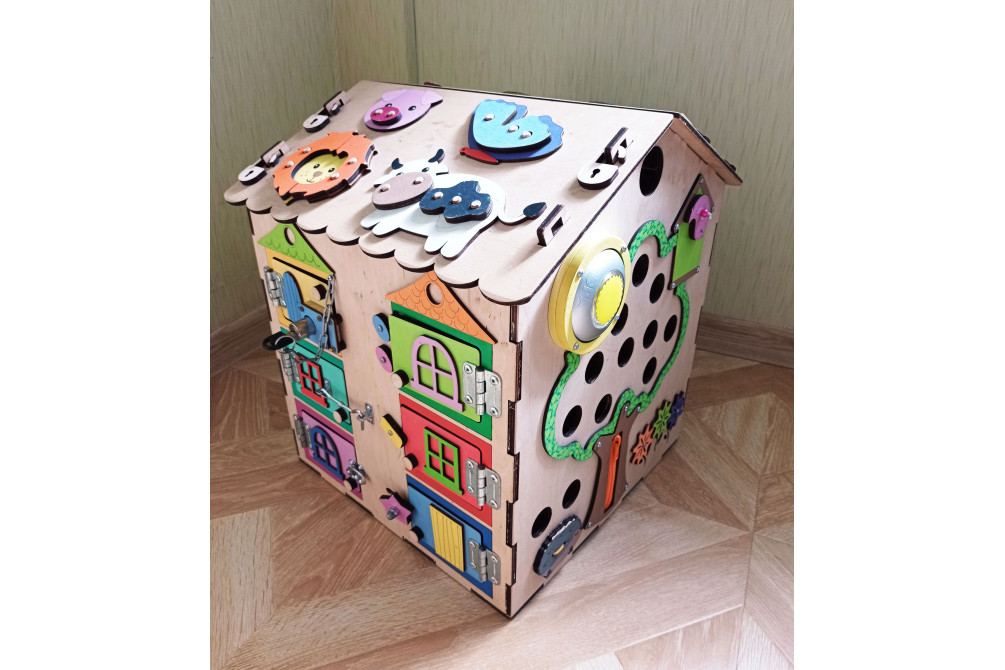 С другой стороны ребёнку предлагают поиграть с лабиринтом, забрасывая в отверстия деревянные монеты с изображениями овощей и фруктов — яблоки, ананасы, арбуз, тыква, бананы и др. Неподдельный интерес вызовет у юного исследователя панель с выключателем, звонком и розеткой. Дети любят повторять действия взрослых в повседневной жизни. Только с домиком это будет безопасная игра. Шнуровки, застёжки, фастексы, липучки — всё это способствует развитию координации движений и мелкой и крупной моторики.