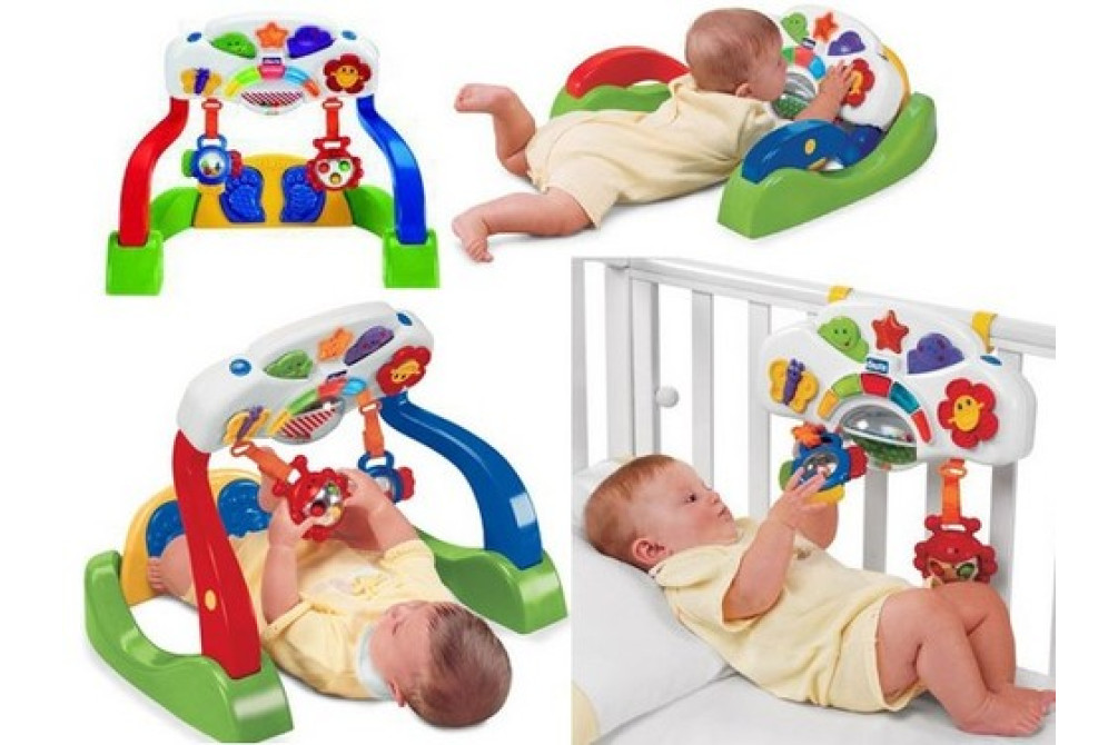 Chicco »Спортзал DUO» представляет собой игровой центр, где ребенок упражняется координировать первые движения, при этом весело играя. Комплекс дает необходимую нагрузку мышцам, развлекает и успокаивает. »Спортзал Duo» можно использовать 2 различными способами: играть лежа на спине, есть тренажер для ног (после 3-х месяцев), играть лежа на животе (после 5-ти месяцев). Панель развивающего комплекса, благодаря специальным креплениям, можно устанавливать на детской кроватке.
