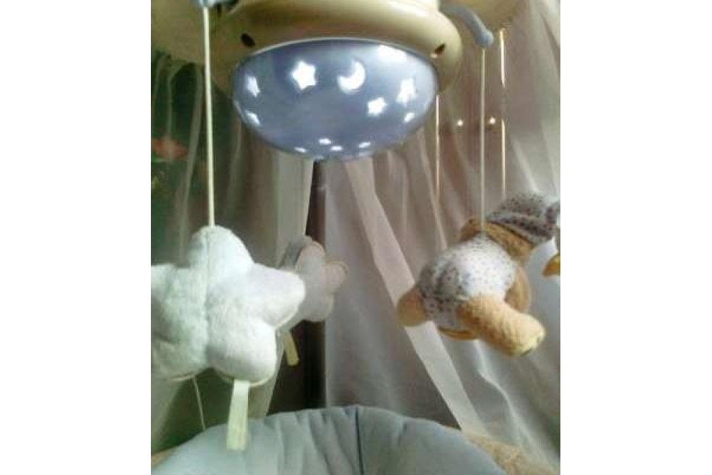 Световые и музыкальные эффекты. Балдахин, проектор и мобиле. Регулируемый подъемом спинки — две позиции. Съемная панель применяется как столик-ограничитель. Трехточечный мягкий пояс на липучке. Два вида колебательных движений: вперед-назад и влево-вправо. 6 скоростей укачивания. Сидение вращается вокруг собственной оси, фиксируется в любой точке. Каруселька из мягких фигурок, 16 мелодий, журчание реки, пение птиц, ритмичные песни для дневного времяпрепровождения, а также успокаивающие вечерние звуки сверчков, кваканье лягушат и 8 успокаивающих мелодичных колыбельных. Световая проекция звездного неба. Работа от батареек или от сети. Шнур поставляется в комплекте.