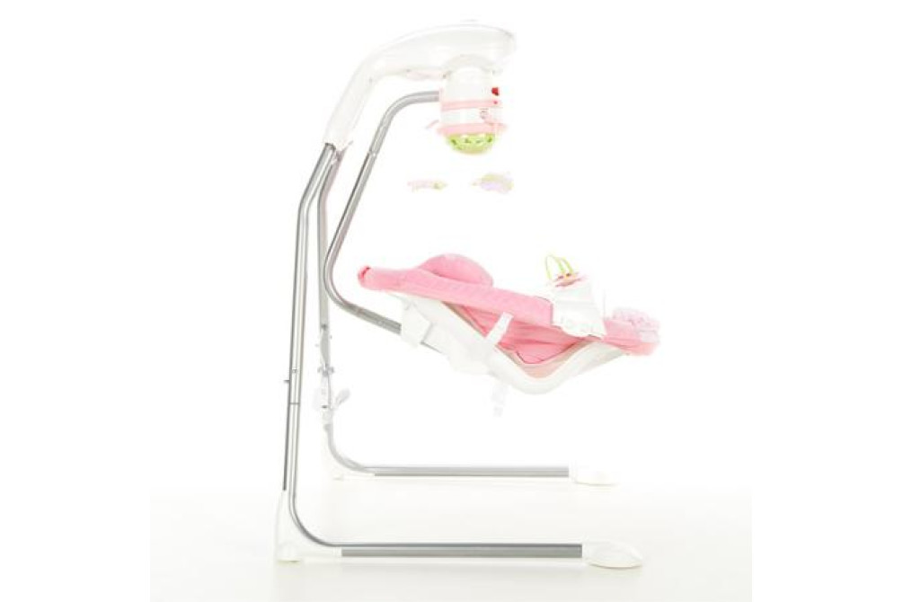 Карусель с цветными игрушками и проектором. 3 плюшевые игрушки. Купол для световых проекций. Спинка сиденья регулируется в 2-х положениях. Направления движения: вправо-влево и вперед-назад. 6 скоростей укачивания. 16 мелодий (8 развлекательных, 8 успокаивающих) и 3 звуковх эффекта, регулировка громкости. Съемный столик, широкая сидячая часть кресла, которая имитирует объятие мамы, широкая и очень мягкая подушка для поддержаниия головы ребенка. Игрушки для развития на панели сиденья. Трехточечный ремень безопасности. Работа от сети или 4-х батареек LR 20 (в комплект не входят).