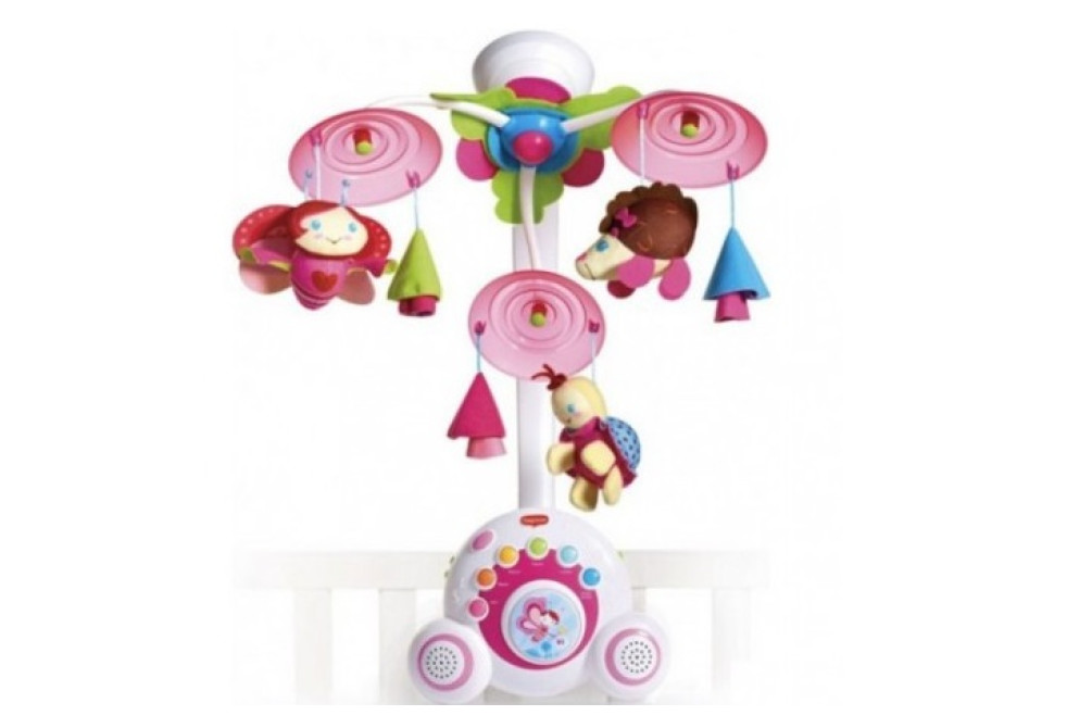 Мобиль имеет 3 подвижные платформы, к каждой из которых прикреплена мягкая игрушка в виде животного и мягкая разноцветная елочка, из коллекции Tiny Love «Моя принцесса».