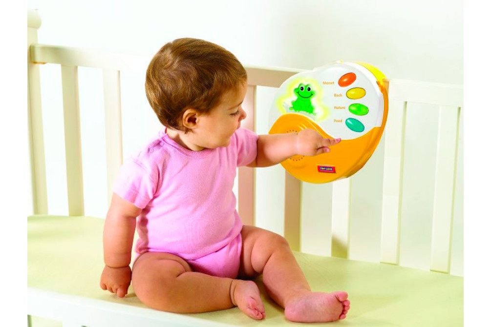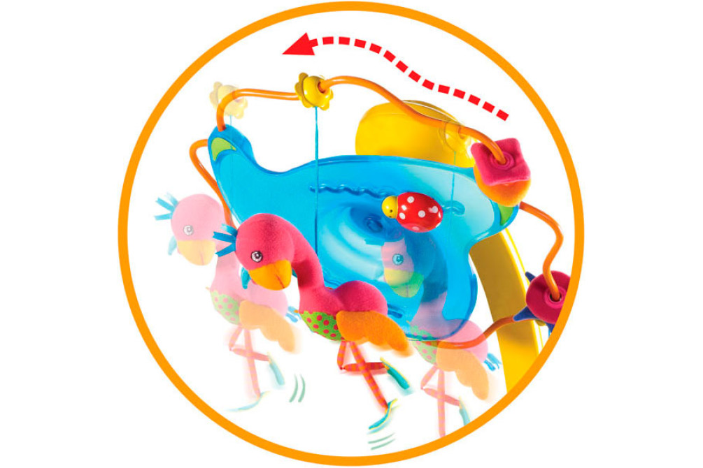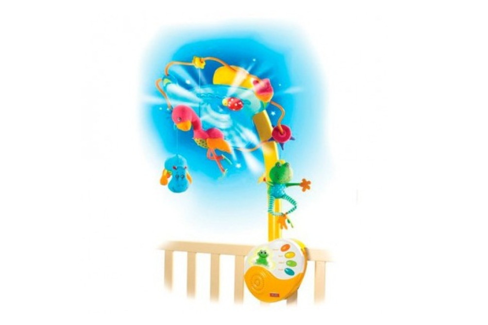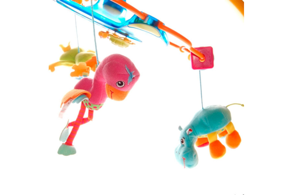 Возраст от 0 до 5 месяцев. Мобиль раскрывает над малышом кусочек голубого неба, вокруг которого перемещаются лягушонок, бегемотик и фламинго, а божья коровка и черепашка двигаются по зигзагообразной траектории. Многомерное ритмичное движение, классические мелодии и звуки природы создают приятную, успокаивающую атмосферу. Разглядывая фигурки животных, малыш учится концентрировать внимание на движущихся предметах. Мягкий свет создает успокаивающую атмосферу, 20 минут непрерывной музыки: 4 мелодии (2 классические и 2 со звуками природы), успокаивающий ночничок. Функции - музыка, ночничок и вращение мобиля могут быть включены как одновременно, так и по отдельности, движение по зигзагообразной траектории, развивает познавательные и коммуникативные навыки. Мобиль развивает органы чувств, общие двигательные навыки, мелкая моторика, познание, коэффициент эмоциональности. Удобный пульт дистанционного управления, подвижные предметы, контрастные детали.