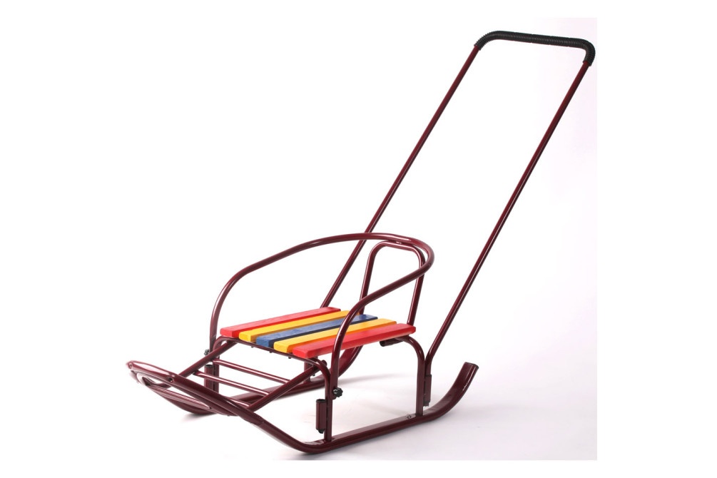 Сиденье санок сделано из деревянных планок. Ручка толкатель имеет два положения — ребенка в санках можно расположить лицом к себе и от себя.