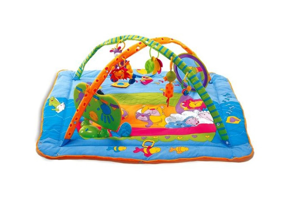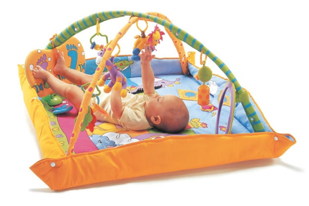 Для детей с рождения. Тканевая поверхность размером 102 х 110 см. Игрушки: белочка с шуршащим хвостиком, шебуршащее солнышко, пищалка-овечка, мышка, змей, а также каркас из дуг, которые возвышаются над малышом с разнообразием подвесных игрушек. Среди них утенок с колокольчиком, жираф, лев, бабочки, погремушка-прорезыватель, зеркало, большое по размеру, которое познакомит его с собственным изображением. Музыкальная интерактивная панель, которая работает в двух режимах - музыкальный и игровой. Комплекс можно применять как импровизированный манеж, подняв бортики, зафиксировать их, застегнув на кнопки.