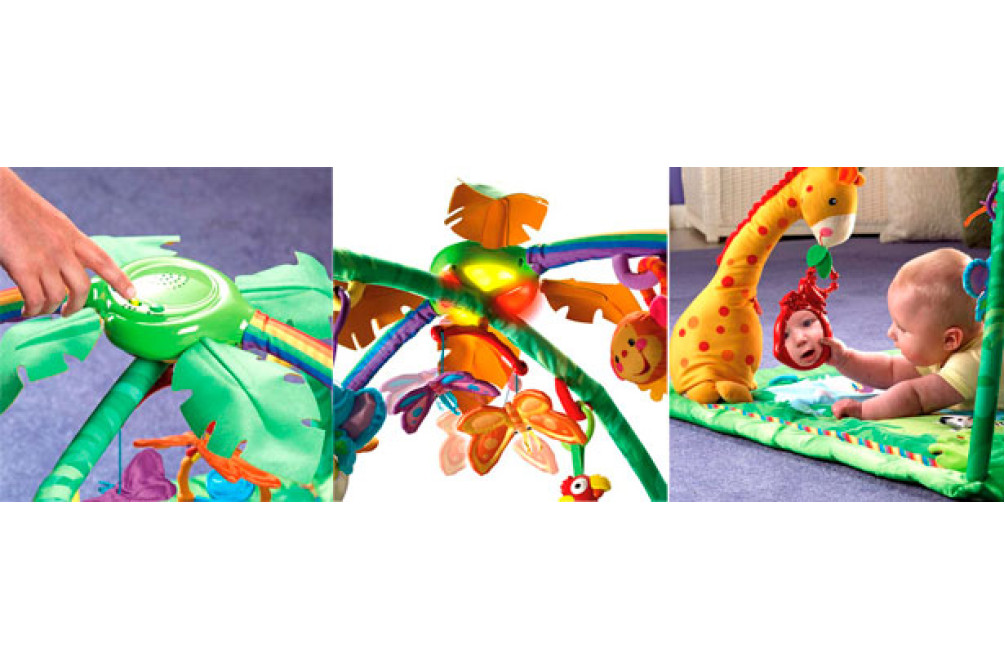 Яркий игровой коврик »Тропический лес» надолго развлечет вашего малыша. А также прекрасно развивает у ребенка моторику. Много интересных подвесных игрушек. Все движения сопровождаются свето-музыкальными эффектами (мелодии проигрываются до 20 мин.). Все это доставит малышу массу удовольствия. Минимальный срок проката — 1 неделя.
