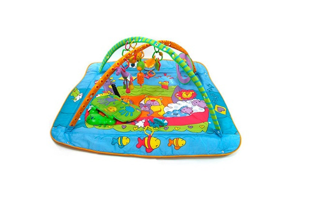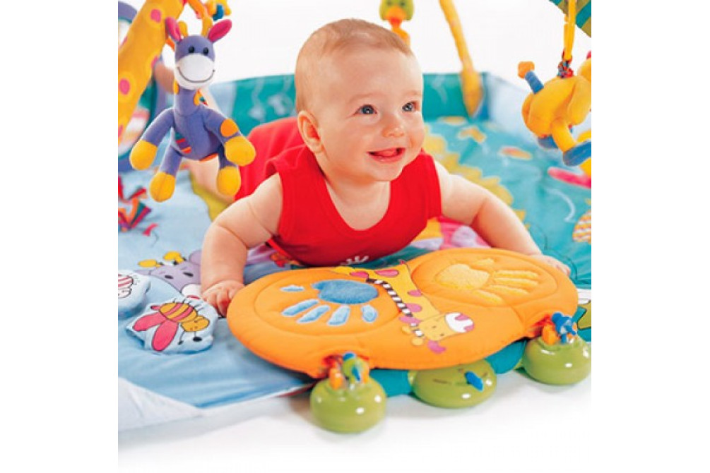 Развивающий коврик Tiny Love "Зоосад" Удобный развивающий коврик со множеством функций состоит из 5 разнообразных игрушек, зеркала и музыкального центра "Стукни и играй". Бортики коврика можно поднять и закрепить при помощи кнопок. Ребенок, играя, тренирует кисти рук, их силу и ловкость. Лежа на животике, малыш стремиться поднимать голову и плечи, чтобы видеть игрушки, картинки и зеркало. На музыкальной панели центра с одной стороны изображены ладошки, а с другой - ступни ног. Если по ним стукнуть, то начинают мигать огоньки и звучат голоса различных животных, а сами ладошки и ступни светятся. В зависимости от положения музыкальной панели – звучат разные музыкальные композиции и голоса животных. Также есть второй режим работы – 15 мин. звучит приятная музыка Моцарта. 5 игрушек, которые можно повесить на дуги: погремушка пластмассовая с разноцветными рельефными колечками, прорезыватели для зубов с 3-мя разноцветными бабочками, звенящий, мягкий утенок, мягкая погремушка Жираф, мягкая погремушка Львенок.