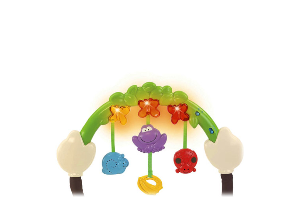Для детей весом до 9 кг. Мягкая на ощупь плюшевая обивка в форме обезьянки. Удобный наклон спинки. Успокаивающий виброрежим. Панель «Kick & Play». Светомузыкальная дуга с игрушками работает в двух режимах: автоматический – бабочки мигают разноцветными огнями в такт веселых мелодий и ручной – когда малыш тянет за лягушку раздаются забавные мелодии и звуки и переливаются огоньки. В лапки обезьянки вмонтированы погремушки. Любое движение пружинит и раскачивает шезлонг. Ребенок сам может задействовать музыкальные и звуковые эффекты, потянув за игрушку. Для игровой панели нужны 3 батарейки типа АА и 1 батарейка типа D для виброблока.