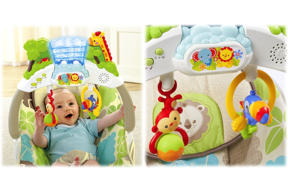 Шезлонг Fisher Price »Друзья из джунглей» для самых маленьких. Прекрасно развлечет малыша интерактивными игрушками, расположенными на съемной игровой дуге, звуками тропического леса. А если пришло время поспать – уютная люлька с мягким подголовником окружит младенца уютом и комфортом. Успокаивающая вибрация быстро убаюкают малыша. Шезлонг оснащен световыми и музыкальными эффектами (12 различных песенок и звуков). Предназначен для детей от рождения и до 9 кг веса. Батарейки: для вибрации – 1хD, для игровой дуги — 4хАА (не включены в комплект). Минимальный срок проката 1 месяц. Оценочная стоимость 140 у.е.
