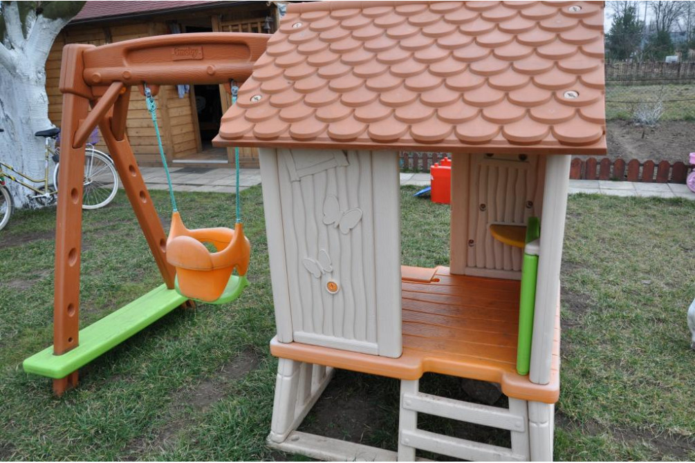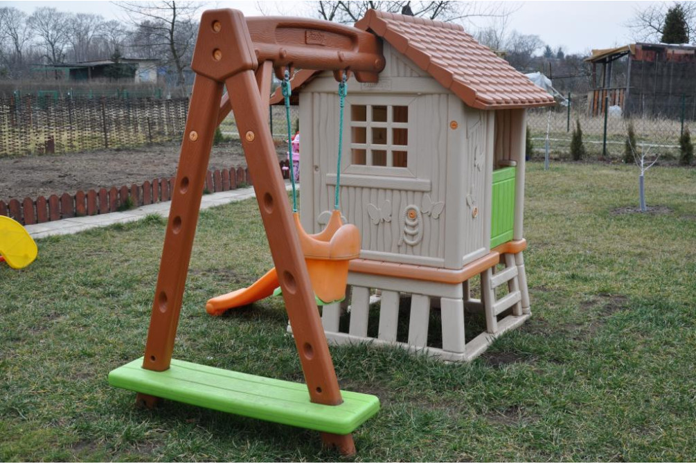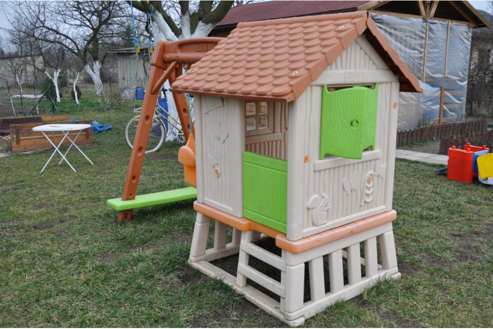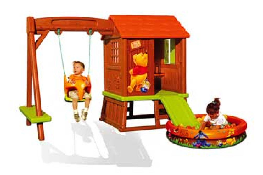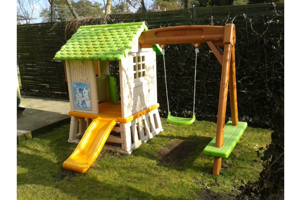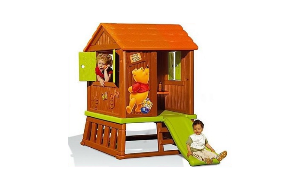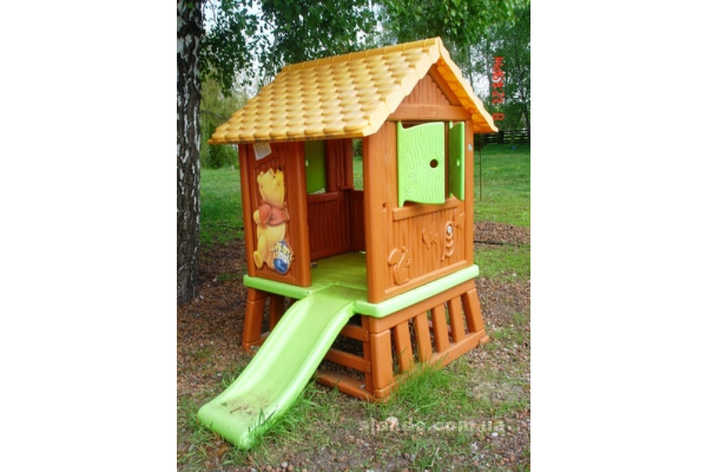 Этот комплекс подойдет для детей с 2 лет и порадует как малышей, так и взрослых. А также станет прекрасным украшением для садового участка. Хотя его можно использовать и в закрытых помещениях. Состоит площадка из домика-беседки и небольшой, съемной горки, с которой детвора с огромным удовольствием будет скатываться. Рамы дверей и окошек сделаны в виде веток дерева. Наклейки с любимыми героями мультиков оживят игру ребятишек. У двери прикреплен звоночек для гостей. В общем скучать не придется.