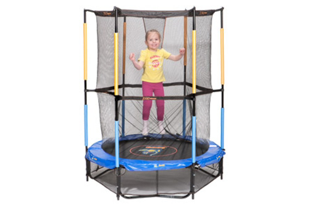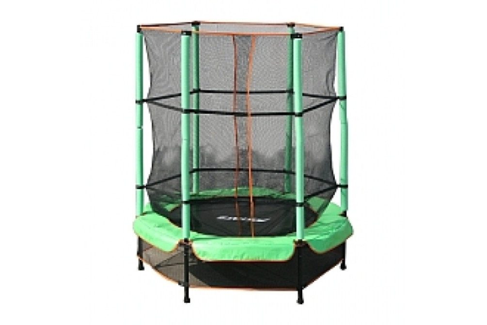 Для детей от 3 лет. На шести опорах. Диаметр 140 см. Высота 160 см. Высота от пола 35 см. Максимальная нагрузка 35кг. Защитное ограждение выполнено в виде мелкой сетки. Ограждени регулируется по высоте.