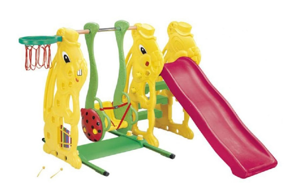 Для детей от 1,5 до 8 лет. Окрашен в яркие цвета. В основе используется полый высокопрочный структурный пластик с надежными крепежными элементами. Комплекс не имеет острых углов. Боковая часть лесенки сделана в виде силуэта зайца с улыбающейся мордочкой. Широкие ступени облегчают путь наверх. Изображение божьей коровки на боковинах. Специальное игровое кольцо. Используется как на улице, так и в закрытых помещениях. Комплектация: Пластиковая горка. Лесенка. Кольцо баскетбольное. Качели. Размеры 160 х 111 х 111 см. Высота горки 1,11 м. Занимаемая площадь 1,11 х 1,60 м. Допустимая нагрузка 80 кг. Вес 22,0 кг.