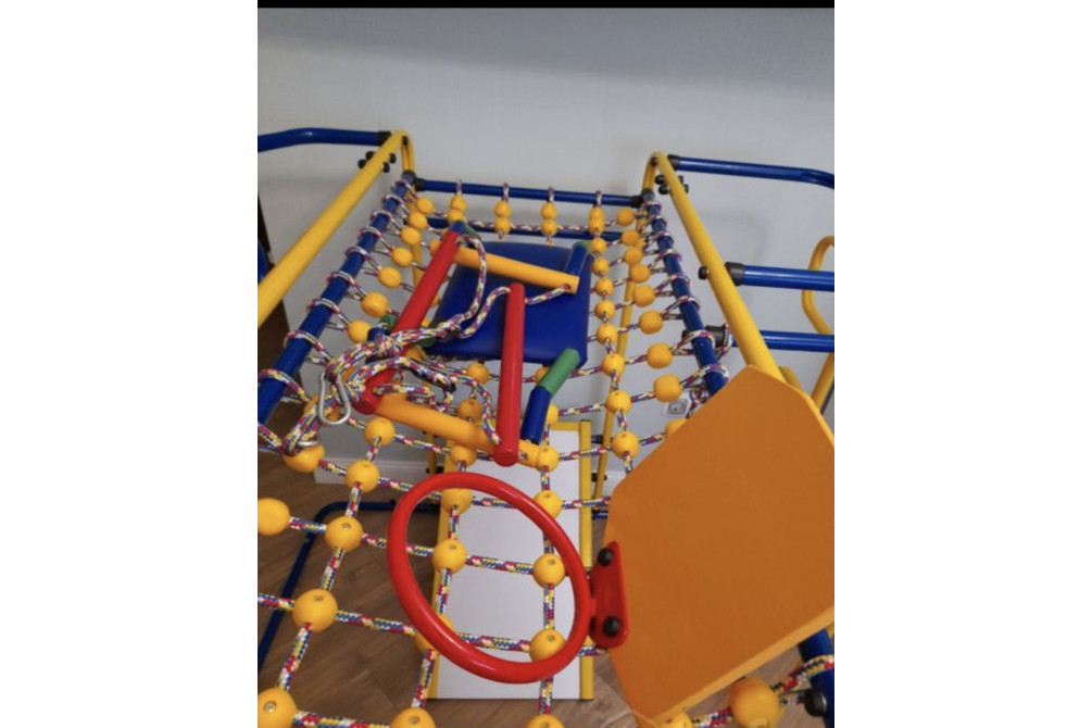 Комплектация: тарзанка, веревочная лестница, качели, сетка для лазания, панель с отверстиями, горка, баскетбольное кольцо, мольберт со счетами, гимнастические кольца.