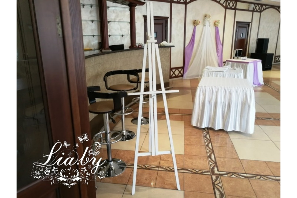 Белый деревянный мольберт. Высокий, не складной, только откидывается задняя распорка. Высота мольберта в сложенном (плоском) состоянии около 1,75 м. При этом распорка длиннее ног. Предназначен для размещения на нем планов рассадки, картин, постеров или других изображений на жестком каркасе.
