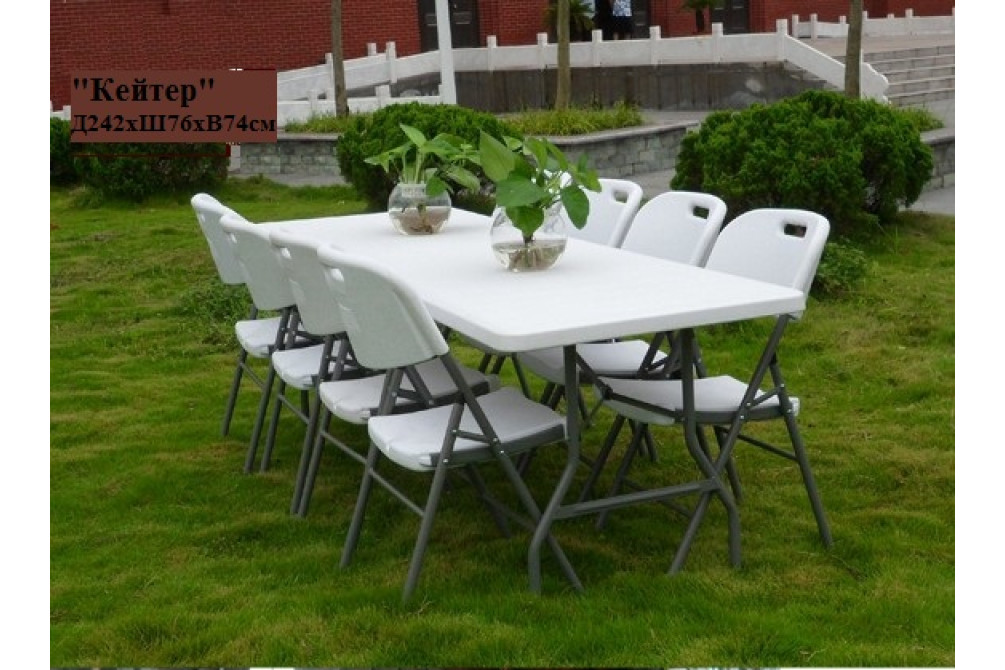 Размер 240 х 76 х 74 см. Вместительность 8 - 10 персон. Столешница - пластик. Цвет - серый мрамор. Складной металлический каркас, порошковая краска и столешница.