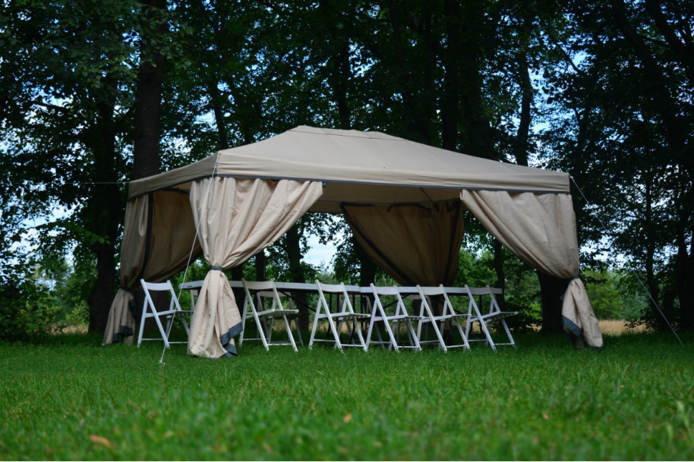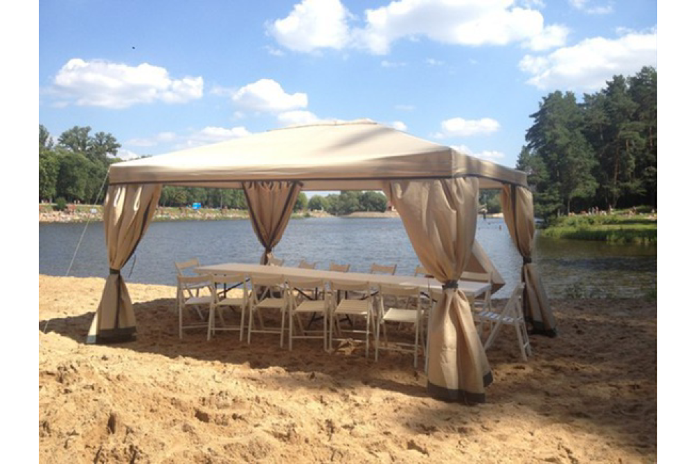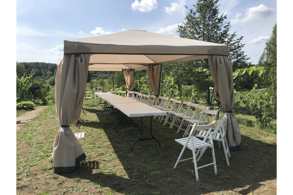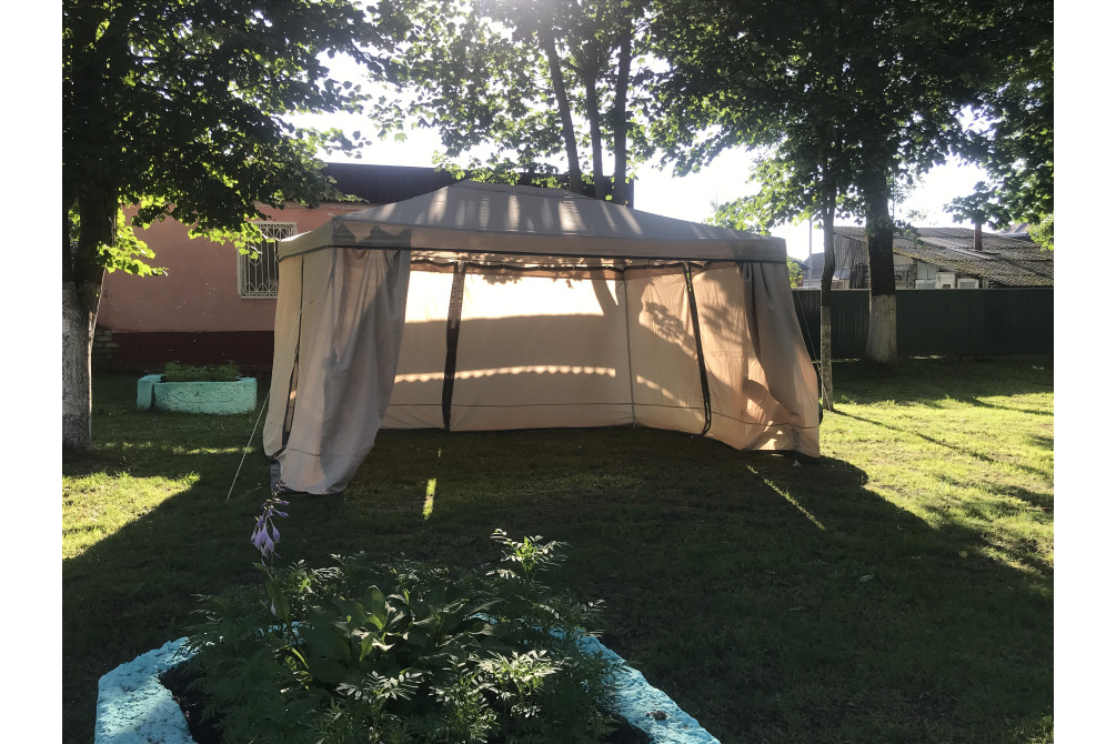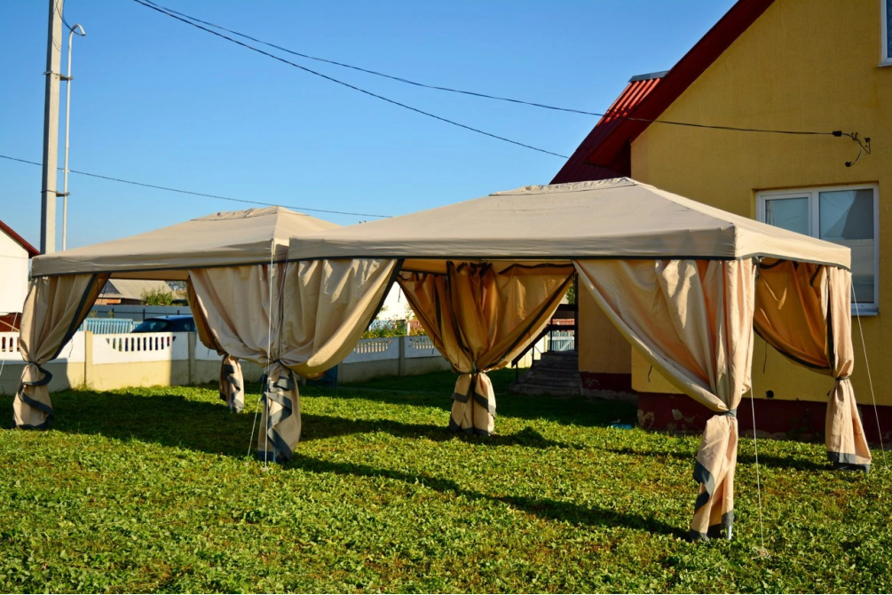 Размер шатра легко разместится на любом участке. Так же шатры стыкуются между собой и создают большую конструкцию.