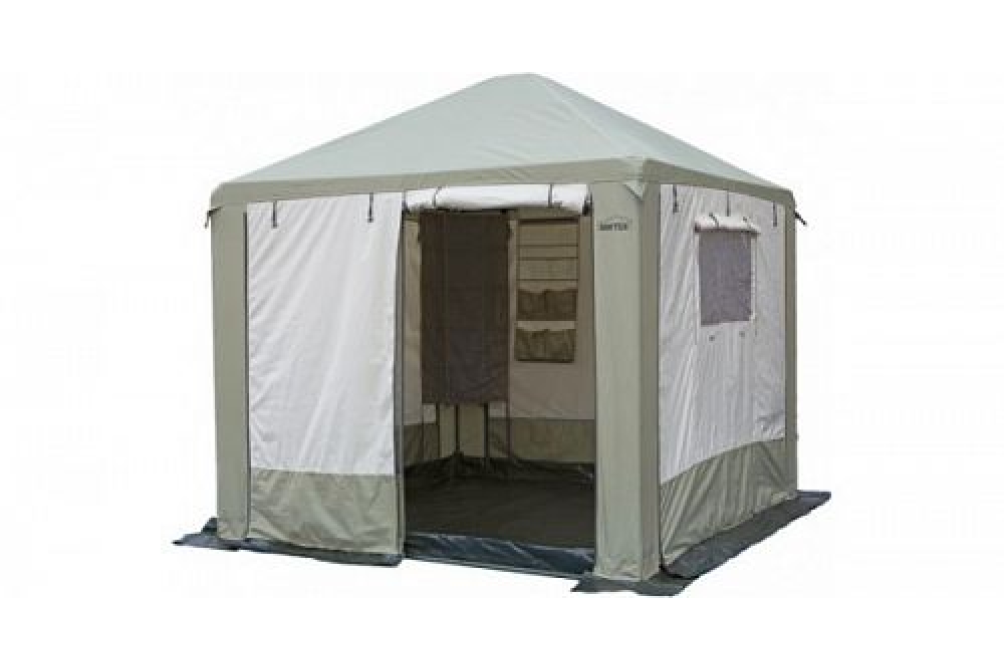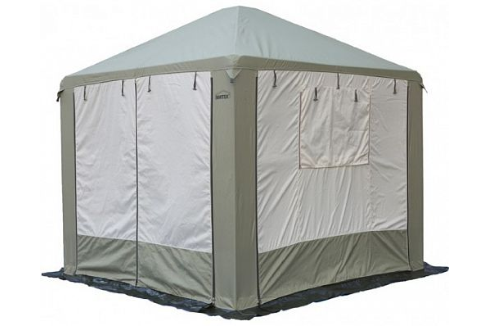 В двух противоположных боковых стенах имеются окна из прозрачной пленки, закрывающиеся шторками на молниях.