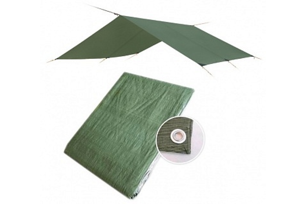 Тент водостойкий защитный для укрытия людей, автомобилей, дров, механизмов от воздействия окружающей среды ― дождя, солнца, ветра. По краю пропущен усиливающий капроновый шпагат и установлены металлические кольца-люверсы.