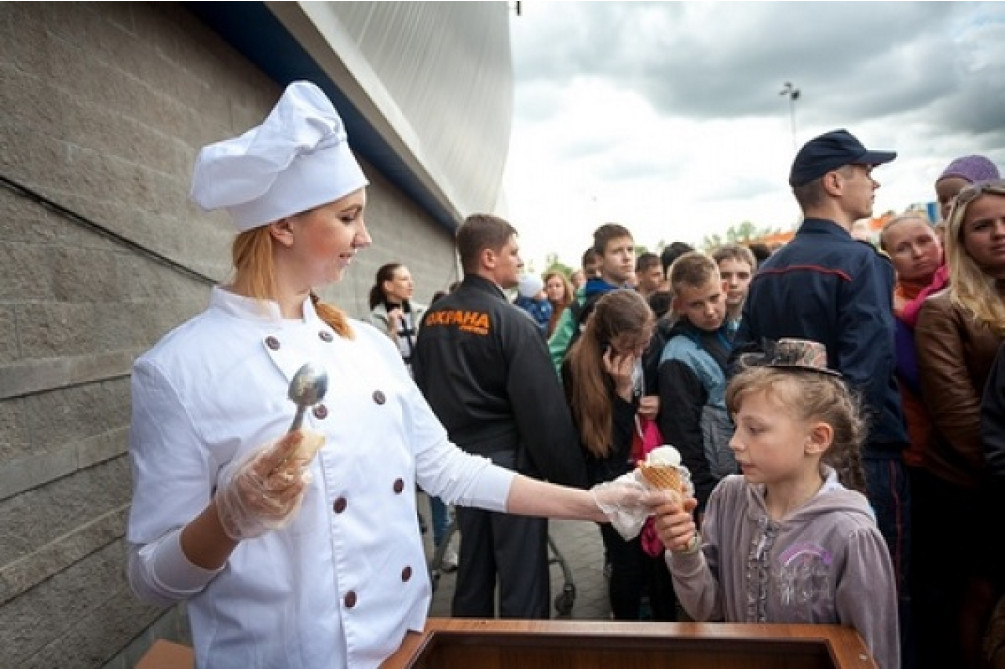 Раздачу порционного/развесного мороженного пофессиональным мороженщиком в костюме шеф-повара.