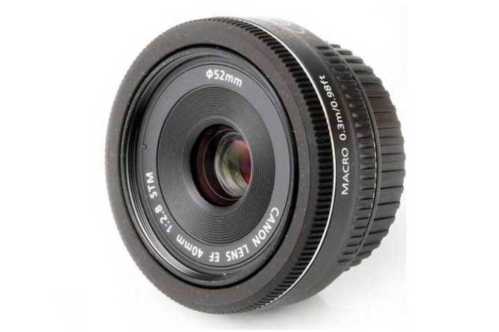 Это в своем роде уникальный сверхкомпактный "объектив-блинчик" Canon EF 40 mm f/2.8 STM имеет одно очень серьезное нововведение для системы EOS — шаговый мотор фокусировки (STM). Это нововведение ориентировано для улучшения автофокусировки при работе камеры в режиме LiveView, а также для использования автофокуса при видеосъемке. Кольцо фокусировки не имеет механической связи с системой фокусировки, оно управляет лишь шаговым двигателем, приводящим механизм в действие. Оптическая схема включает в себя 6 элементов, объединенные в 4 группы, включая 1 асферический элемент. Диафрагма 7-лепестковая, диаметр светофильтра — 52 мм, размер — 68*23 мм, масса объектива — 130 грамм. Минимальная дистанция фокусировки — 25 см.