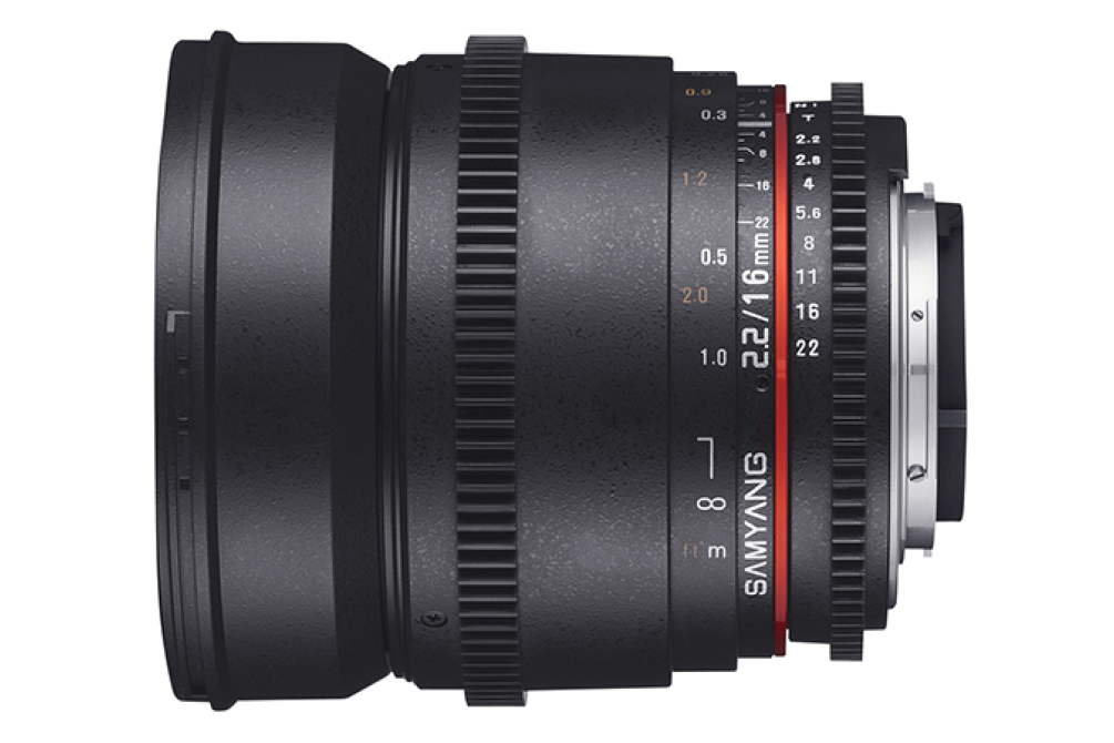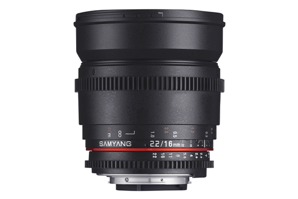 Широкоугольный объектив Samyang MF 16mm T2.2 ED AS UMC CS VDSLR специально адаптирован для профессиональной цифровой видеосъемки, но может использоваться и для фотосъемки. Объектив совместим с камерами, имеющими сенсор формата APS-C или меньший. Кольца фокусировки и установки диафрагмы имеют стандартную резьбу с модулем 0.8мм, что позволяет использовать этот объектив с системами фоллоу-фокус. Регулировка диафрагмы осуществляется плавно, без щелчков, что особенно важно при видеосъемке. Шкалы фокусировки, диафрагмы и глубины резкости нанесены на боковой поверхности объектива для облегчения работы ассистента оператора (Focus puller), обычно находящегося сбоку от камеры.