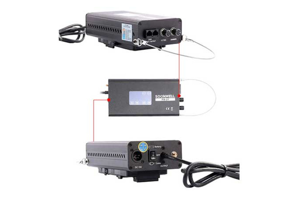 Управление прибором осуществляется с помощью пульта, на котором расположен ударопрочный LCD экран с отображением параметров работы и сенсорными кнопками управления, диммеры регулировки яркости и цветовой температуры, вход и выход DMX для подключения удалённого управления с помощью пульта, а также разъем антенны для беспроводного управления (опция, приобретается отдельно). Корпус пульта управления выполнен из металла и имеет ремешок из металлической проволоки для возможности подвешивания пульта.