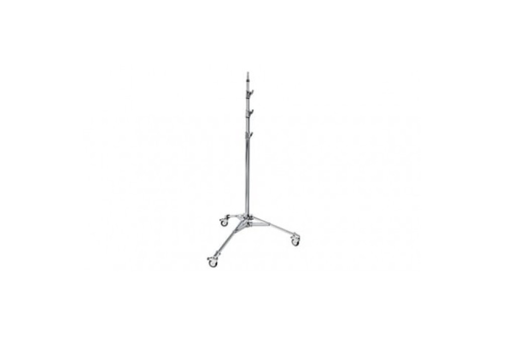 Стойка с низким основанием, на колесах с тормозами, основание и первая труба колонны - стальные, телескопические трубы - алюминиевые.