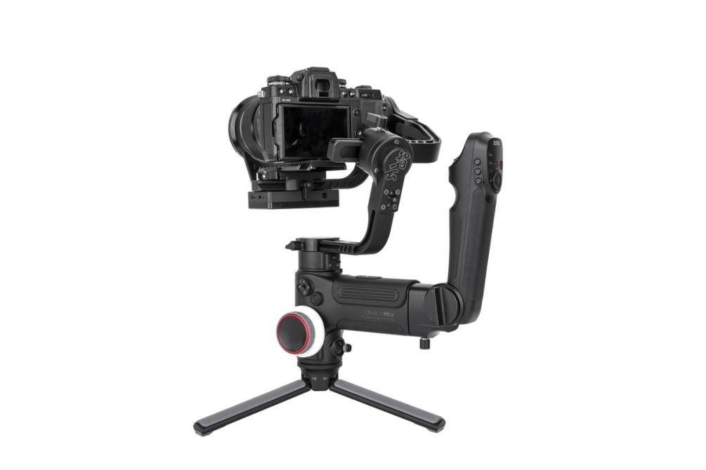 Zhiyun Crane 3 Lab предлагает в качестве дополнительного эргономического удобства – регулируемую ручку сзади стабилизатора. Если накрутить треногу, то можно использовать двуручный хват, при котором одна рука будет отвечать за кнопки управления, а другая за фокусировку.