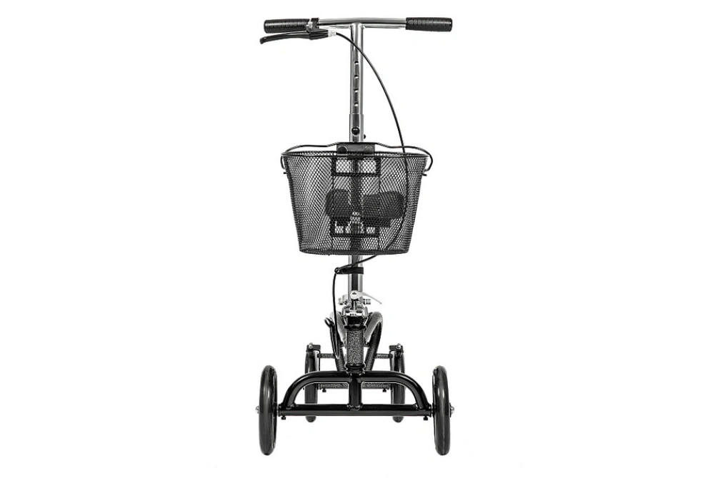 Малый вес (10 кг). Ручной стояночный тормоз на рукоятке руля. Опора под колено, регулируемая по высоте и