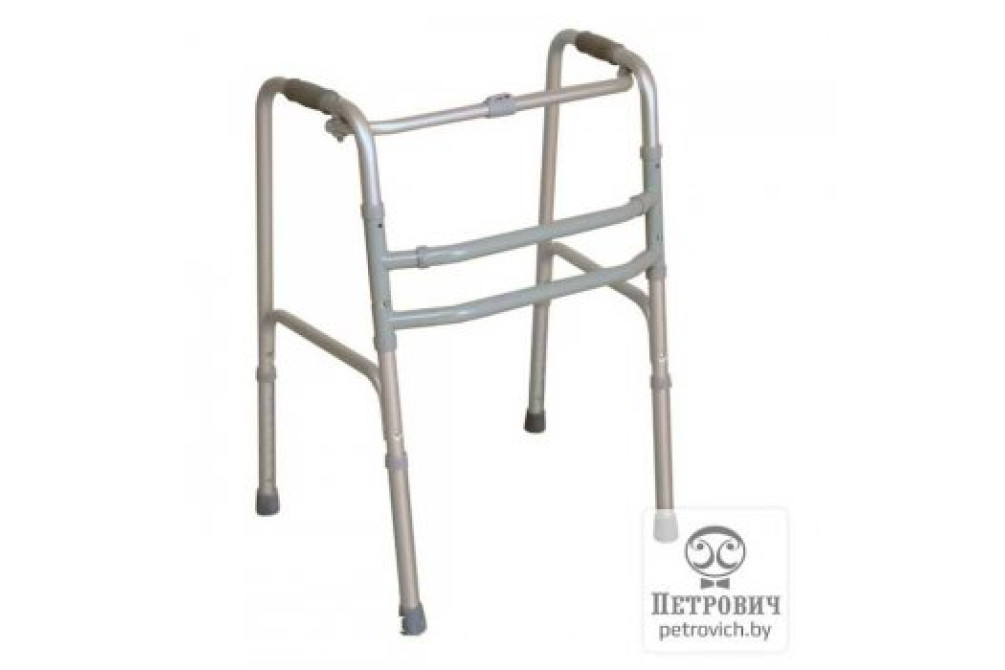Ходунки предназначены для реабилитации инвалидов, обеспечивают дополнительную надежную опору при передвижении людей с нарушением двигательных функций. Ходунки легко складываются. Конструкция состоит из двух боковых рам и усиленной двойной центральной рамы. Ходунки изготовлены из анодированных алюминиевых трубок, с лаковым защитным покрытием. Надежная фиксация в сложенном и разложенном виде обеспечивается кнопочными замками, простыми, удобными и безопасными в обращении. На боковых опорах установлены мягкие поручни. Высота опоры регулируется от 66 до 81 см через каждые 2,5 см. В конструкцию опоры-ходунка заложена функция «ШАГАНИЕ». Пациент при ходьбе, руками опираясь на поручни, поочередно переставляет одну боковую сторону, затем другую.