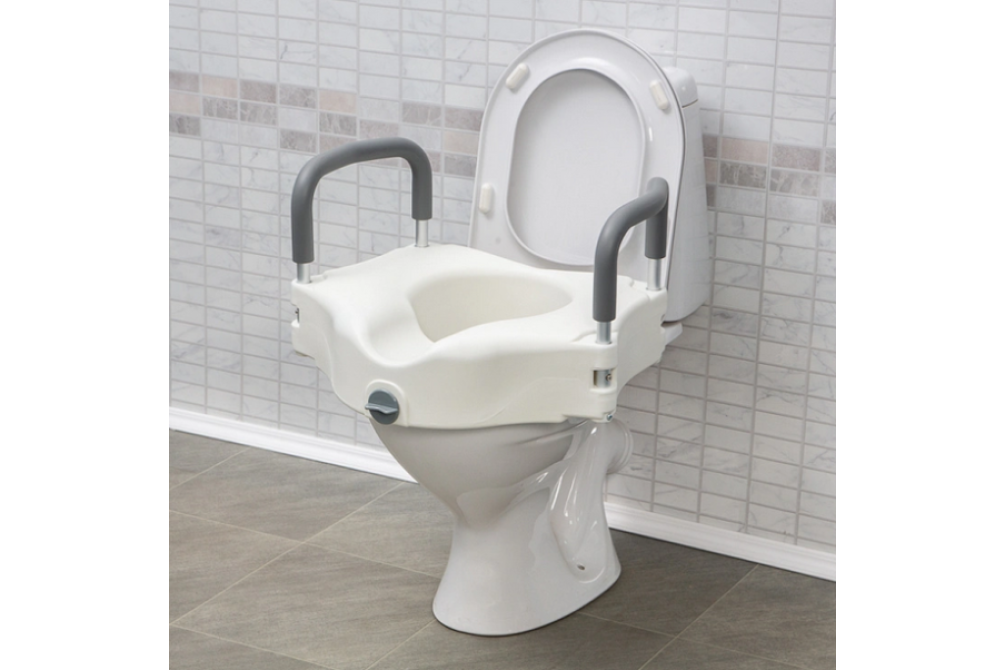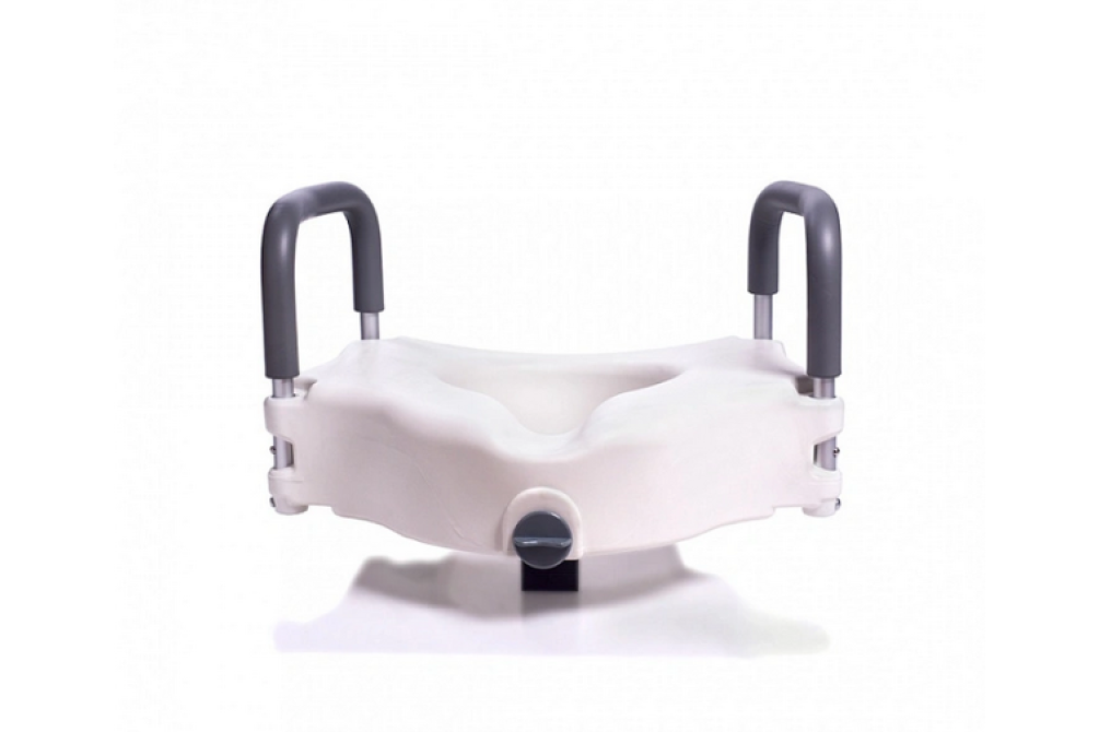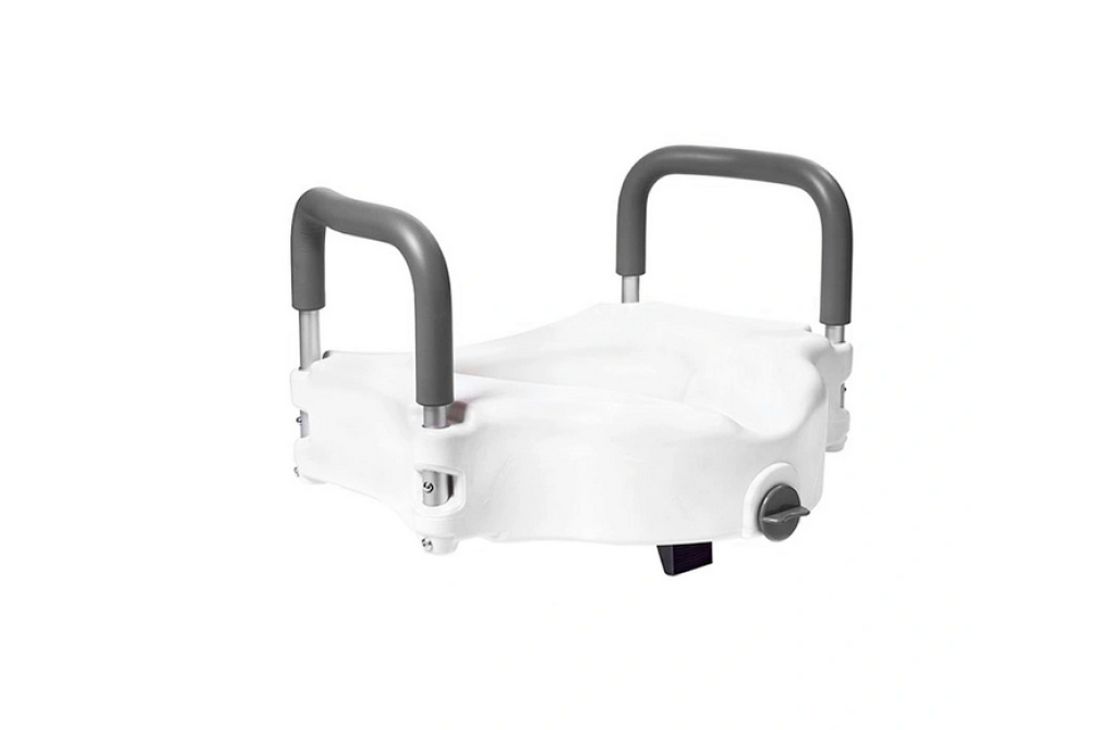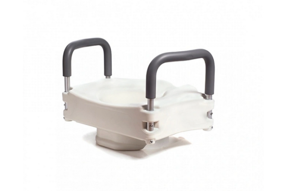 - Пластиковая насадка на унитаз со съемными поручнями увеличивает высоту унитаза