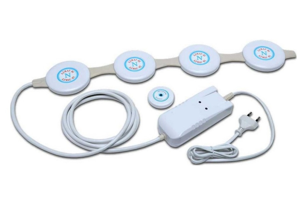Прибор магнитотерапии Алмаг 01 Конструкция: электронный блок + 4 узла воздействия. Излучает бегущее импульсное магнитное поле, проникающее глубоко в ткани. Снимает воспаление и боль, способствует возвращению работоспособности суставов, улучшает самочувствие. Применение прибора не требует специальной подготовки. Применяется для лечения более 50 заболеваний и травм опорно-двигательного аппарата, в том числе остеохондроза, артроза и артрита различных суставов, венозных, неврологических и дерматологических заболеваний. Не вызывает привыкания (организм воспринимает каждую процедуру как новую). Глубина проникновения магнитного поля — до 8 см (достаточно для лечения внутренних органов брюшной полости).