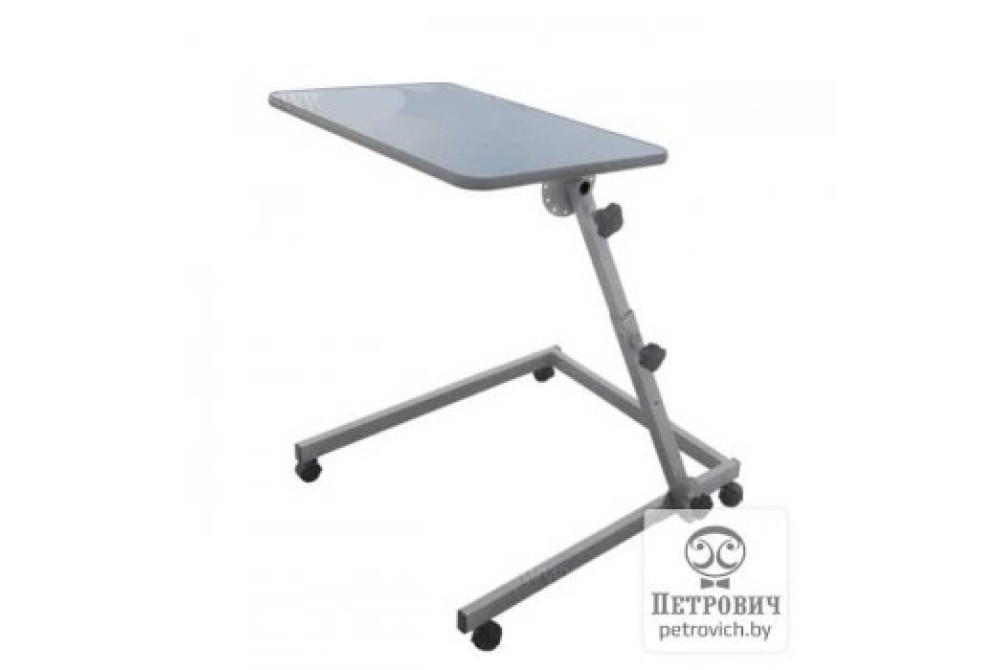 Стол подкатной предназначен для использования у кресла или кровати для приема пищи или чтения. Благодаря U-образному основанию и смещенной опоре, стол может подкатываться к креслу, например инвалидному. Ножки стола и U-образное основание оказываются сперва и слева от кресла, а вертикальная опора поворотного столика наклоняется к сидящему. Остается выбрать угол наклона самого столика, который регулируется в пределах 180 градусов с шагом в 30 градусов. Плавная регулировка высоты в пределах 500…1000 мм поможет выбрать оптимальное положение стола
