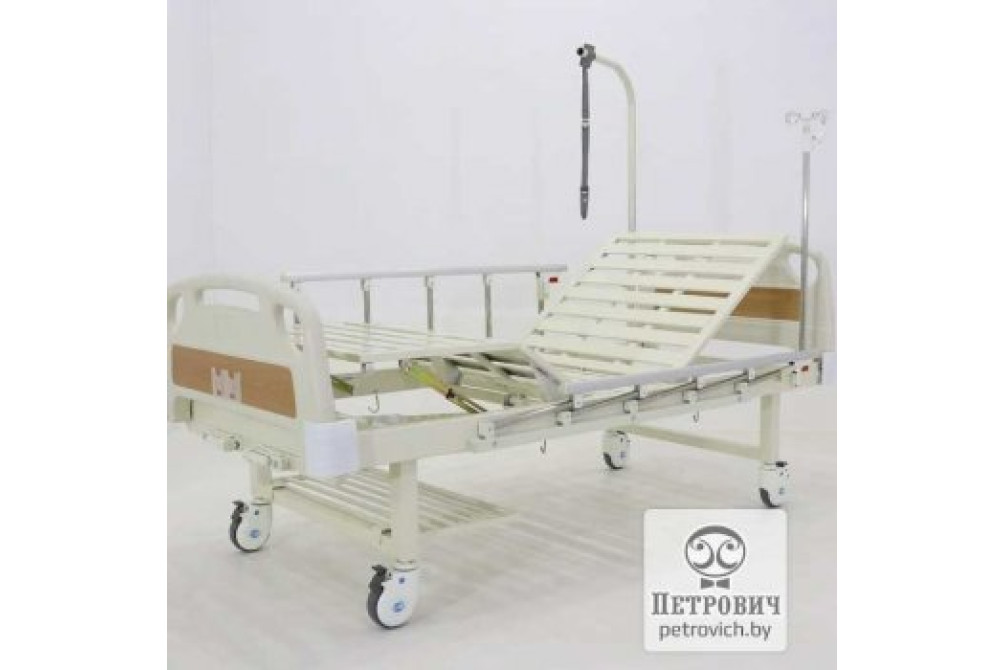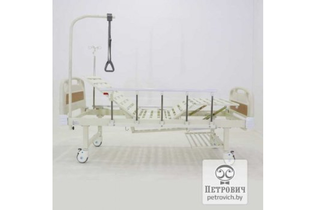 Кровать - 4-х секционная, снабжена червячным механическим приводом регулировки угла наклона спинной секции и угла наклона ножной секции. Основание кровати выполнено из стали, покрыто ударопрочной эпоксидной эмалью. Механизмы регулировки наклонов секций ложа кровати оборудованы складными рукоятками. В сложенном состоянии рукоятки приводов не выступают за торцевое ограждение кровати. Боковые ограждения (2шт) выполнены из алюминия и легко опускаются, обеспечивая быстрый доступ к пациенту. Несущие колеса кровати изготовлены из высокопрочной стали, что обеспечивает их долговечность, колеса также оснащены индивидуальными тормозами. Поставляется без матраса.