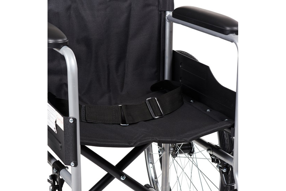 Мягкие подлокотники. Регулируемая подножка. Широкое посадочное место. Большие задние колеса. Складная конструкция позволяет перевозить кресло в общественном транспорте или в багажнике легкового автомобиля. Для сопровождающего добавлены прорезиненные ручки.