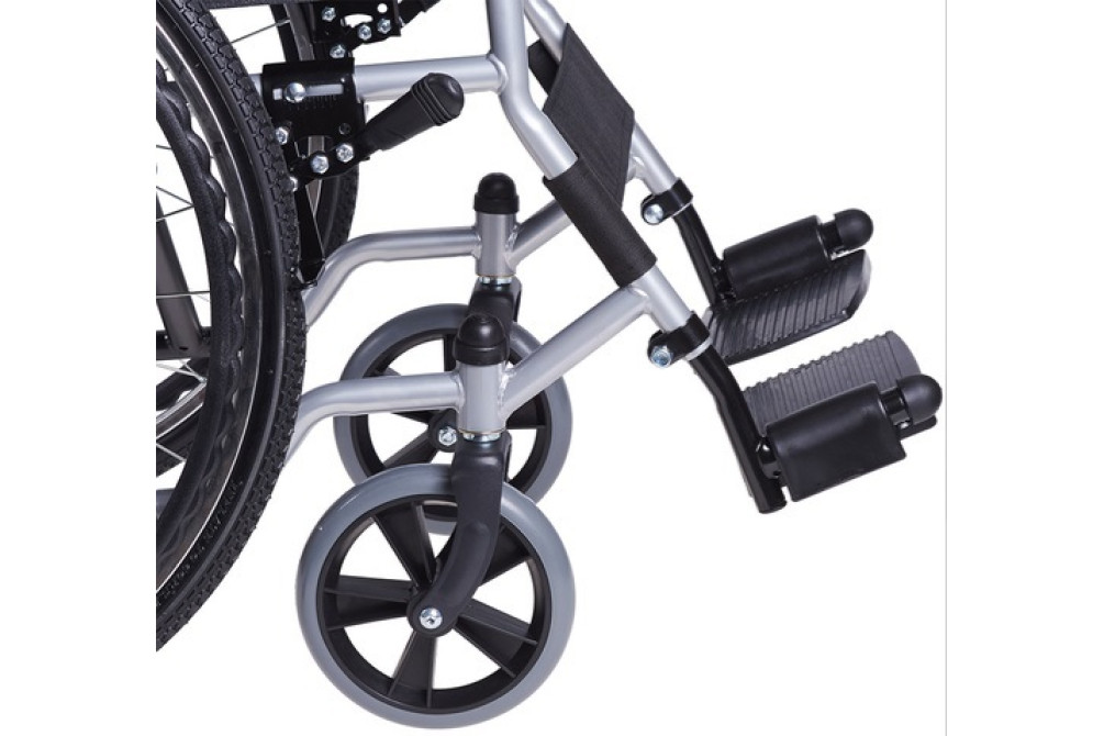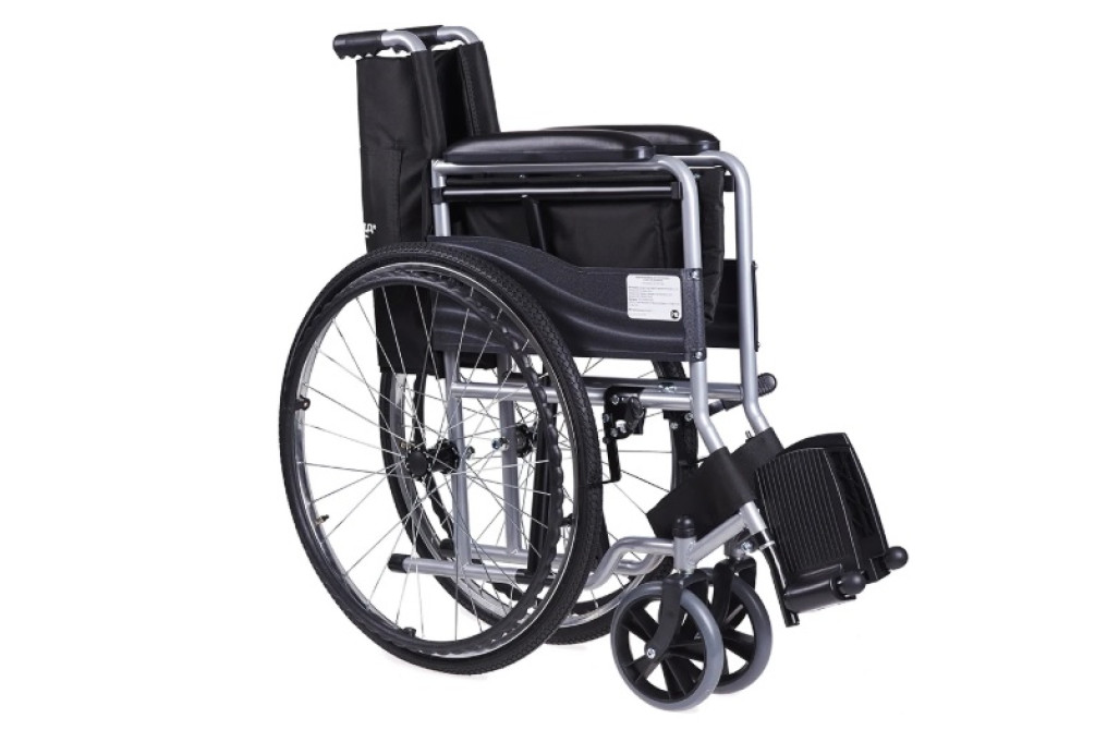 Мягкое сидение с воздухопроницаемой нейлоновой тканью. Регулируемые подножки для ног. Ремень для фиксации положения тела. Стояночный тормоз. Коляска изготовлена из прочного металлического сплава. Для сопровождающего добавлены прорезиненные ручки и вместительная мини-сумочка.