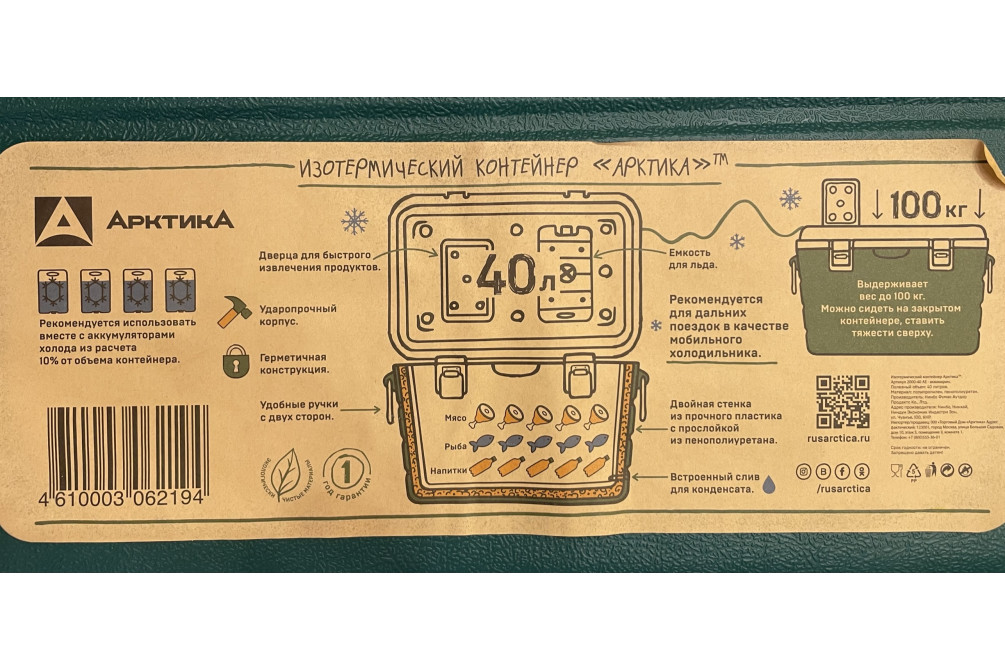 40 - литровый изотермический контейнер «Арктика» может выступать в качестве временной замены холодильника в путешествии или во время загородного отдыха.
